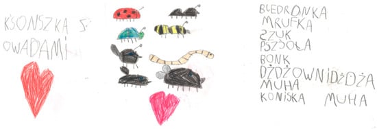 On the next pages Dobrawa gives names of the insects. BIEDRONKA is a correct version, MRUFKA should be mrówka, ów is perceived as uf. SZUK should be żuk, ż is replaced by sz (the letter s is a mirror image). PSZĆOŁA appears instead of pszczoła where cz is replaced by ć. BONK should be bąk, again, the nasal vowel ą is spelled phonetically as on, which is phonetically correct because before the consonant k, ą sounds as on. DŻDŻOWNIDŻDŻA should be dżdżownica. Hypercorrectness can occur when relying heavily on spell-checking and trying to recall memorised word. It happened here that the child asked her father for help, and he showed her the correct pattern of the word, whereas the child was trying to memorise and reproduce it. MUHA should be mucha, so, here we deal with a typical orthographic mistake when h and ch are confounded. KONISKA MUHA should be końska mucha, ń is transcribed as ni, and the same typical orthographic mistake is repeated.