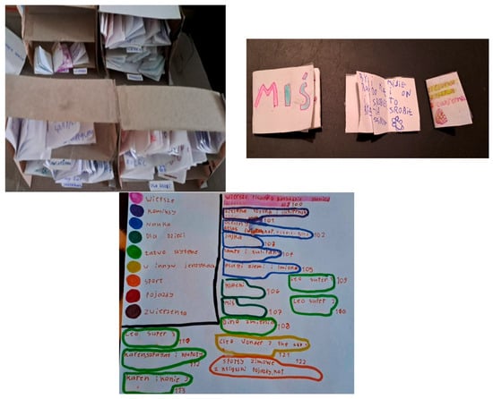 Recently, Helena (aged 11) and Dobrawa (aged 8) undertook a substantial project by creating a mini-library (Figure 2). The collection consists of 28 books in Polish and one in Finnish, which they either authored themselves or adapted, with permission, from existing Polish publications. Notably, despite the original intention to include books in several languages, the children chose to produce the library predominantly in Polish. In addition, four English-language books contributed by a friend are also included. The library is organised with a cataloguing system, and books may be borrowed; parents and friends have even been issued library cards.