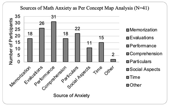 A total of 41 participants completed the math anxiety concept map. The number of nodes created by each participant varied, with the highest number being 19 and the lowest being 3. An overall analysis of the concept maps revealed a total of 247 nodes related to math anxiety. The most frequently mentioned concerns were related to grades, tests, quizzes, and homework. Among these, the top three factors contributing to math anxiety in preservice teachers were tests (15 mentions), homework (13 mentions), and grades (13 mentions). The summary of the main factors associated with math anxiety is given in Figure 2. The various factors identified through the concept maps can be further categorized as described below: