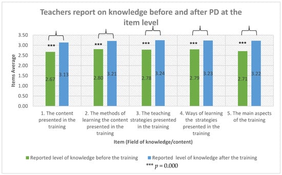 Further differences were examined in the teachers’ reported level of knowledge before and after the PD at the item level. To examine these differences, t-tests for dependent samples were conducted for each of the 5 items. The items reported by the teachers that indicated different types of knowledge after the PD program were significantly higher than before the PD program. The fields of knowledge dealt with the content presented in the PD (various literacy skills such as: decoding, reading accuracy, reading fluency, vocabulary, and reading comprehension), different strategies for literacy skills, and the different learning methods presented in the PD. Table 4 presents the comparisons between the items according to the time of measurement. Figure 3 shows the change in knowledge levels and the differences in teachers’ reports at the item level.