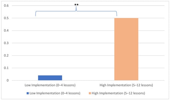 To examine changes in teachers’ literacy self-efficacy following the PD program across the entire sample of participants, we conducted a 2 × 2 ANOVA with repeated measures. The analysis revealed a significant main effect of time (F[1,80] = 6.02, MSE = 2.00, p < 0.05, η2 = 0.07), indicating that teachers’ literacy self-efficacy significantly increased from pre-PD (M = 5.45, SE = 0.09) to post-PD (M = 5.72, SE = 0.10) across all 82 teachers in the study (see Figure 4). This finding demonstrates that the PD program was effective in enhancing teachers’ confidence in their ability to deliver literacy instruction, regardless of their subsequent implementation levels.