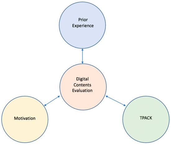 Digital Content Evaluation (DCE) competency is defined in Kim et al. (2017) as “a teacher’s capacity to use knowledge and skills in technology, pedagogy, content, and academic standards as well as affect-motivation to evaluate digital content.” The authors proposed a model for DCE that includes several components (see Figure 2). First, DCE appears to be closely tied to knowledge as conceptualized in the TPACK framework, described in the previous section. The authors argued that, since evaluation occupies the highest level in the hierarchical organization of cognitive building blocks according to the taxonomy proposed in Bloom (1956), it requires other thinking skills. For this reason, DCE draws upon prior knowledge, which the authors conceptualized through TPACK. Moreover, they highlighted how evaluation tasks involving digital content have the potential to enhance teachers’ awareness of the interaction between the different components of TPACK. Second, the authors presented DCE as being connected to teachers’ prior experience. In particular, they noted that previous studies had emphasized the influence of prior experience on TPACK development and on the implementation of technology. Given the role of TPACK in the development of DCE mentioned earlier, the authors emphasized how teachers’ previous experience with technology—especially professional development for technology integration and prior use of technology—affects DCE. Finally, the authors linked DCE competency to the construct of motivation, as understood within the expectancy–value framework (Eccles & Wigfield, 1995). Specifically, they argued that evaluation requires self-regulatory cognitive effort, and, thus, motivation is a fundamental enabler in the development of DCE competency. Furthermore, improvements in TPACK resulting from engagement in DCE tasks could in turn enhance teachers’ perception of their own progress, thereby boosting their motivation (Kim et al., 2017).