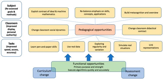 The Pedagogical Opportunities Map, proposed in Pierce and Stacey (2010), is a theoretical framework associated with a specific type of technology: mathematics analysis software. In particular, it provides a taxonomy of the pedagogical opportunities supported by this particular piece of technology. As shown in Figure 3, the pedagogical opportunities enabled by the technology are made possible by underlying functional opportunities, such as the ability to execute algorithms quickly and efficiently. Specifically, the Pedagogical Opportunities Map identifies ten ways in which technology can be used to enhance learning. These are organized into three levels. At the first level, we find pedagogical opportunities that the teacher might exploit during the task design phase, such as the opportunity to link different representations of the same mathematical object through their simultaneous visualization. The second level includes pedagogical opportunities useful for fostering classroom interactions, for example by supporting social dynamics that encourage active student participation. Finally, at the third level, the pedagogical opportunities focus on shaping students’ views of mathematics, such as supporting conceptual understanding.