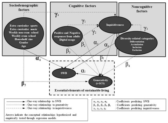 After obtaining written consent from both the participants and their parents, we conducted a questionnaire survey in several school facilities within the study area. The questionnaire was written in simple language understandable by elementary school students and was designed for ease of response using touchscreen devices. The questionnaire asked participants about the following items in order: (i) The Subjective Happiness Scale (SHS) as an indicator of subjective well-being (SWB); (ii) Inquisitiveness, including curiosity and the behavioral tendency to ask questions of adults and peers; (iii) The Revised Generative Concern Scale (r-GCS) as an indicator of children’s generativity; (iv) The perceived costs and benefits of adult responses to children’s questions (i.e., positive and negative effects). These items, together with children’s communication with family members, constitute the interpersonal factors used to capture the quality of social interactions in home and school contexts; (v) Sociodemographic factors, including gender, age, and household size. (vi) Rules governing and frequency of tablet and PC usage; and (vii) Categorical perceptions of belongingness and uniqueness, including inclusion, assimilation, differentiation, exclusion, and an intermediate category. The variables collected in this survey were classified into cognitive, non-cognitive, and sociodemographic domains in relation to generativity and SWB, as part of the “Essential Elements of Sustainable Living” framework (Hirose et al., 2023), described in Figure 1.