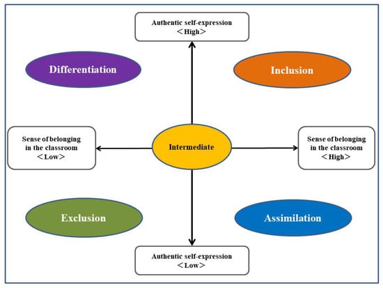 The questionnaire included two items: (1) “I am able to express my true self in my school classroom”, and (2) “I feel a sense of belonging in my school classroom.” Participants responded to each item on a seven-point Likert scale, where 1 indicated that the statement never applied to them and 7 indicated that it applied very often or nearly always. The vertical axis was set to represent “self-expression” and the horizontal axis to represent “sense of belonging”, both on a scale ranging from 1 to 7, as shown in Figure 2. Participants who scored between 5 and 7 for “self-expression” and between 1 and 3 for “sense of belonging” were classified into the differentiation category. Participants who scored between 1 and 3 for “self-expression” and between 5 and 7 for “sense of belonging” were classified into the assimilation category. Participants who scored between 5 and 7 for both “self-expression” and “sense of belonging” were classified into the inclusion category. Finally, participants who scored 4 on either “self-expression” or “sense of belonging” were classified into the intermediate category. These cut-off points (1–3, 4, 5–7) were set in line with prior applications of the inclusion framework, although an element of arbitrariness was inherent in such classifications. In addition, given that Japanese respondents often prefer middle options in survey responses (central tendency bias), those who selected 4 on either or both items were assigned to the intermediate category (Rindfuss et al., 2015), thereby reducing ambiguity in the classification of the other four groups. This classification framework enabled us to capture nuanced diversity experiences in classroom environments. This framework has certain limitations. As the study was conducted in a single city within a rural prefecture (Kochi), the findings may reflect context-specific characteristics of children and may not be readily generalizable to other regions or urban settings. In addition, because the data were collected through a one-time self-administered survey, there is some potential for biases related to the timing of the survey, social desirability, or differences in self-perception. Nonetheless, the study offers important insights into the distribution of children across the five diversity-related categories.