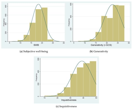 To address research questions (2), (3), and (4), we performed regression analyses using the Subjective Happiness Scale (SHS), the Revised Generative Concern Scale (r-GCS), and the inquisitiveness subscale as dependent variables, respectively. Given that the distributions of these variables are non-normal, often exhibiting skewness, we applied median regression rather than parametric mean-based methods such as ordinary least squares (OLS) regression. We conducted normality tests using the Shapiro–Wilk statistic for all three dependent variables. The null hypothesis of normality was rejected for SHS (), r-GCS (), and inquisitiveness (z = 8.578, p < 0.001). Although the Shapiro–Wilk test is generally recommended for sample sizes ranging from 4 to 2000, our sample of 2158 slightly exceeds this upper limit. To ensure robustness, we supplemented the statistical tests with visual inspection of the distributions using histograms, which also indicated deviations from normality, as shown in Figure 3. These findings indicate that SHS, r-GCS, and inquisitiveness are not normally distributed. Prior research suggests that median regression is more robust than mean-based regression, particularly when the dependent variable is bounded, skewed, or otherwise non-normally distributed, or when extreme values are present (Wooldridge, 2016; Wooldridge et al., 2020). Therefore, we adopt median regression to estimate the determinants of subjective well-being, generativity, and inquisitiveness, using the model specifications presented in Equations (2)–(4).