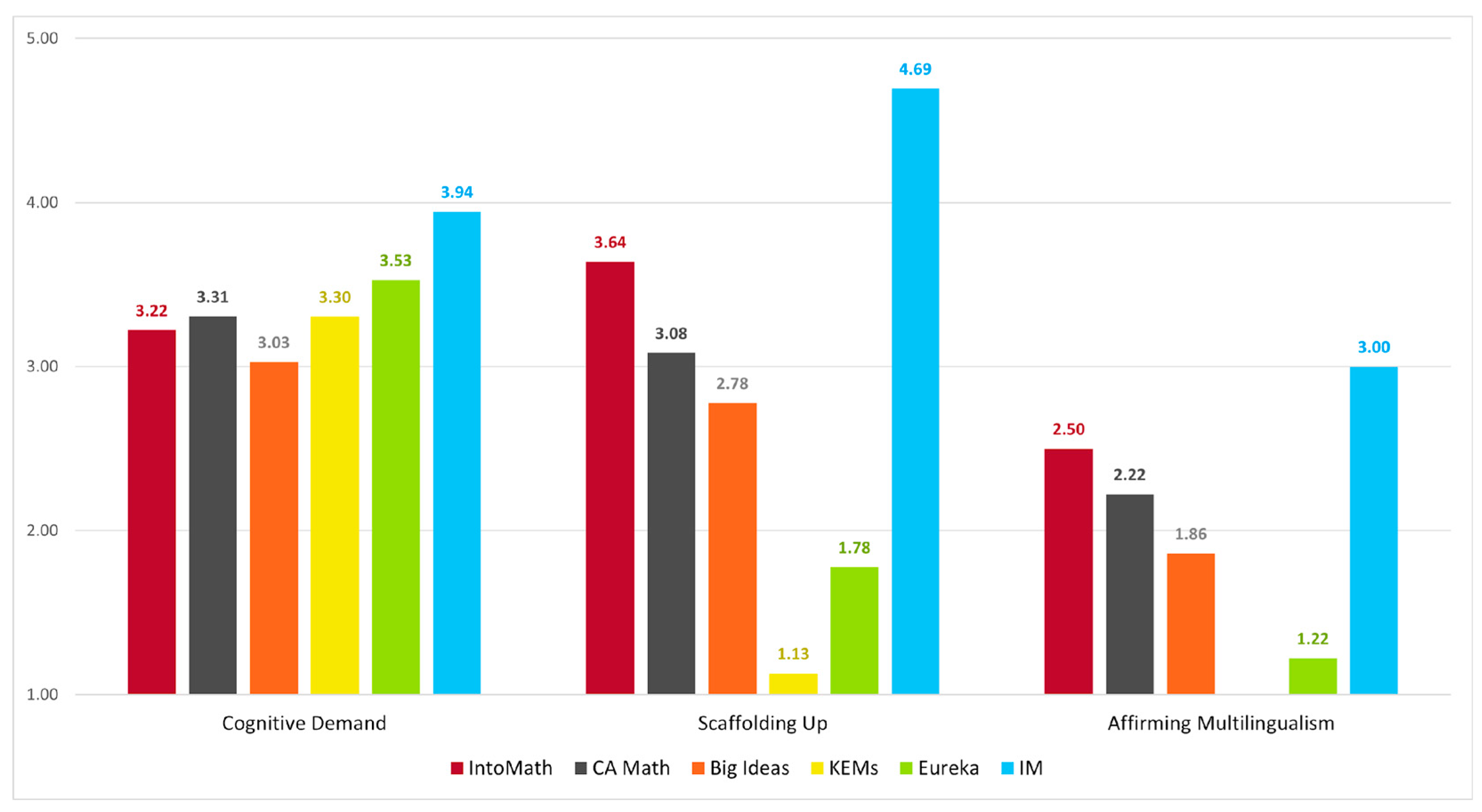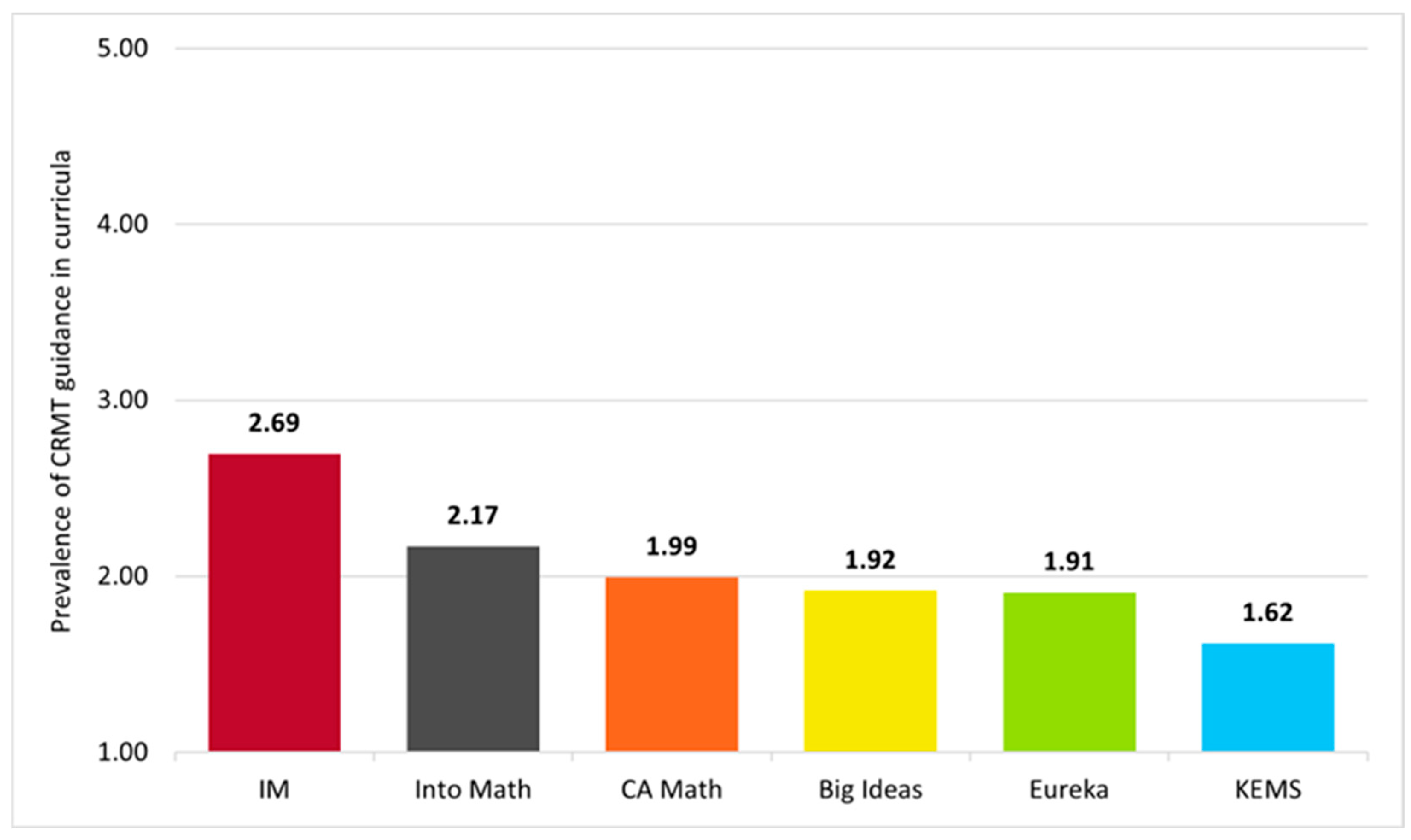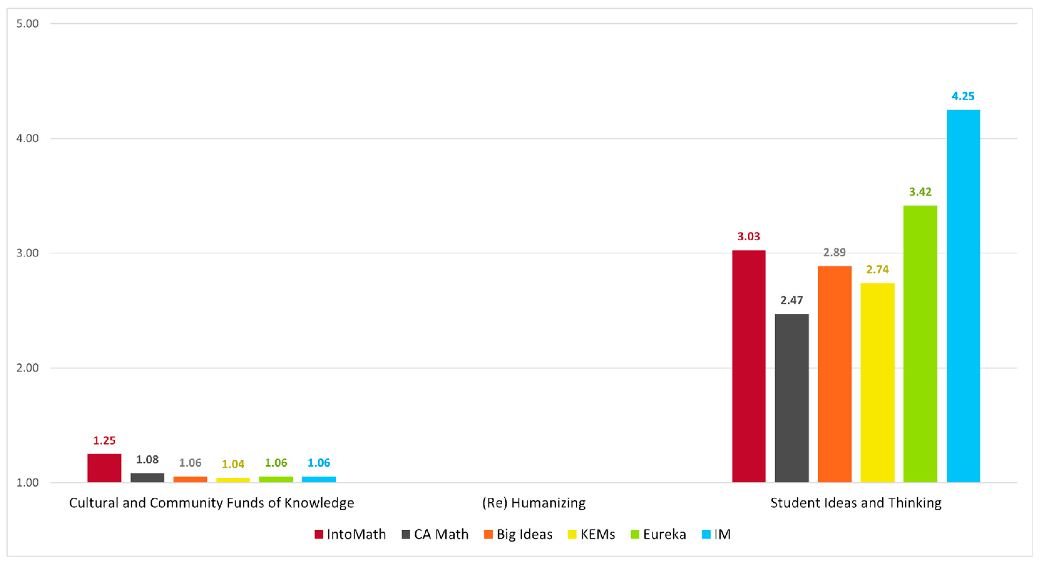 Figure 3). IM included the most guidance to elicit students’ ideas and thinking (an average rating of 4.25) while CA Math included the least (an average of 2.47). All curricula demonstrated only marginal evidence in connecting the mathematics concepts with student’s cultural and community funds of knowledge. None of the materials were found to help rehumanize mathematics by highlighting that mathematics is more than abstract memorization and should draw upon students’ empathy, senses, and feelings.