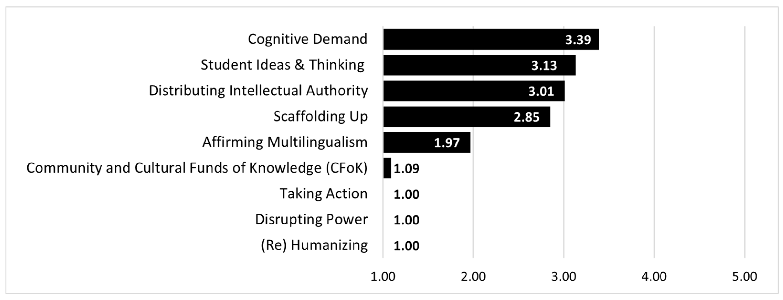 Considering more critical elements of CRM, there were no observed lessons that included any guidance for rehumanizing mathematics. Given the relatively stronger findings concerning the strand of Rigor & Support, lessons that attended to this strand—such as by providing higher cognitive demand tasks or scaffolds for students—could serve as an entryway toward seeing such rigorous mathematics in new, broader, and more diverse terms (i.e., rehumanizing).