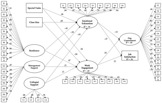 Based on the Job Demands–Resources (JD-R) framework, we estimated a structural equation model that incorporates both central job demands (class size, number of additional responsibilities) and key resources at the individual (resilience) and organizational level (collegial support, support from school leadership). The outcome variables were organizational commitment and job satisfaction. Following the explanations for interpreting standardized coefficients as effect sizes, effect sizes were categorized as small (β = 0.10–0.29), medium (β = 0.30–0.49), and large (β ≥ 0.50) (Fey et al., 2023; Nieminen, 2022). Concerning the direct effects, it can be observed (see Figure 1) that the results of the descriptive analyses are nearly confirmed, specifically that the strongest relationships are found between job resources and the mediating variables, as well as between the mediating variables and the outcome variables. In the following, the indirect effects will be reported and interpreted.