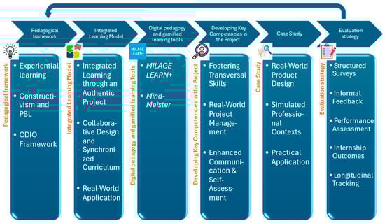 To ensure a clear distinction between the design of the pedagogical innovation and the methodological approach used to assess its impact, this section is divided into two main parts. The first sections (Section 2.1, Section 2.2, Section 2.3 and Section 2.4) present the pedagogical framework, the learning model, the tools, and the case study that form the basis of the cross-curricular, practice-oriented intervention. These subsections detail the rationale and design of the methodology, grounded in educational theory and aligned with the learning objectives described earlier. The second part (Section 2.5) focuses on the evaluation of the methodology. It describes the participants, the assessment instruments, and the data sources used to analyze the effectiveness of the intervention.
