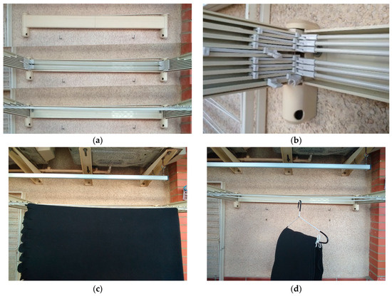 Images of the product design: (a) Outdoor clothesline in different positions: closed, open, and extended; (b) supports of the bar, some of them broken; (c) clothesline with 1 kg clothes, simulating an evenly distributed load; (d) clothesline with 1 kg clothes, simulating a nodal load.