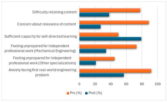 At the beginning of the course, students completed a diagnostic survey to assess their perceptions towards the academic content, learning motivation, and preparedness for professional environments. These responses have served as a baseline for comparison following the experiment. In Figure 6, the responses to the questions included in the pre- and post-surveys are shown. The key findings prior to the implementation included the following: