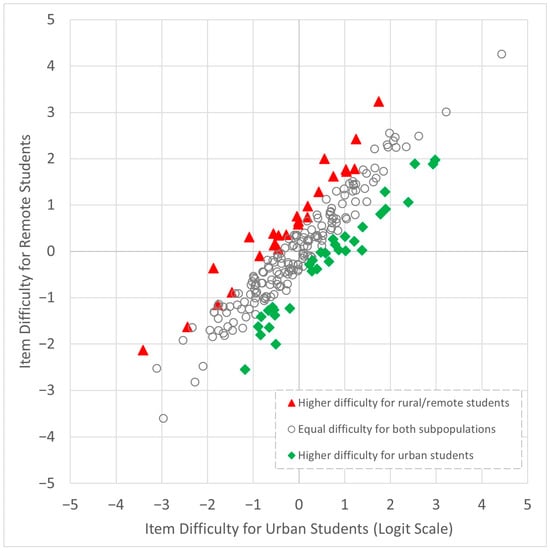 This section presents the results of a sequential mixed-methods analysis. The quantitative phase identifies DIF between urban and remote students in TIMSS 2019 Grade 8 science and isolates the matter-related domains with the largest disparities. The qualitative phase then examines students’ conceptual structures using repertory grids and complementary analyses to interpret these disparities—focusing on the composition of matter and states/changes—and culminates in a group-level comparison of cognitive organization in urban versus remote pupils.