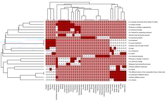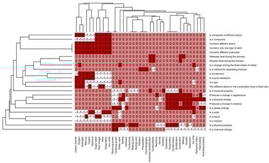 - Kelly Grid Technique: This stage sought to formalize and more deeply assess the understanding of cognitive structures, drawing on Kelly’s RGT (Kelly, 1991), by (a) presenting elements derived from card sorting (E1–E39 in Appendix A) and eliciting bipolar constructs via triadic comparison (e.g., “These two are compounds” vs. “That one is a mixture”); (b) constructing a grid with 39 predefined elements (rows) and student-generated constructs (columns) used to explain their card-sorting results; (c) rating each element–construct intersection on a trichotomous scale (1 = match, 0 = irrelevant, −1 = mismatch); and (d) debriefing through brief interviews to verify their ratings and better understand their reasoning, ensuring the accuracy of the grid data.