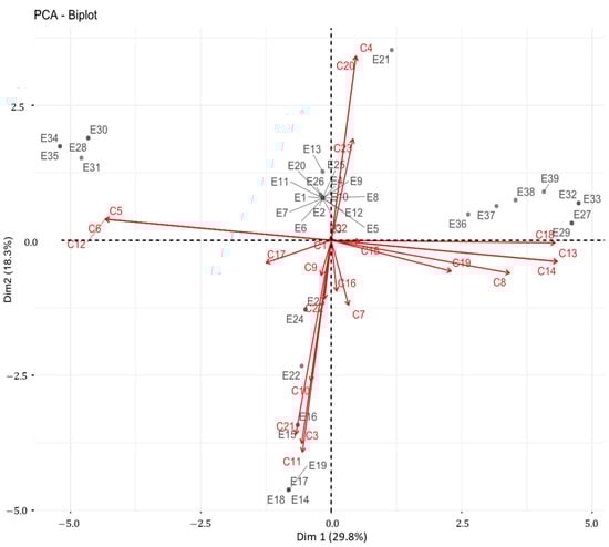 Biplot showing the results of the principal component analysis for the repertory grid of student S1 from a metropolis. The biplot displays construct loadings (red arrows) and element scores (gray points) on the first two principal components (PC1 horizontal, PC2 vertical). For the full definitions of codes, see Appendix A.
