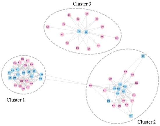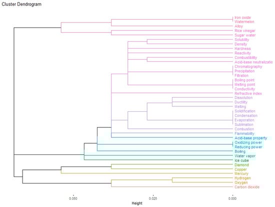 Complementing the PCA, the bipartite graph (as shown in Figure 4) facilitates a clearer visualization of this individual case’s cognitive structure regarding matter-related concepts by simultaneously grouping elements and constructs into interconnected clusters. This bipartite network approach reveals cohesive blocks of associations, making it easier to discern how the student organizes knowledge across domains. Specifically, Cluster 1 aligns with PC1, emphasizing the “Composition of Matter” dimension through groupings of constructs and elements related to multi-type versus single-type compositions (e.g., mixtures, compounds, and pure substances). Cluster 2 corresponds to PC2, capturing distinctions in “Physical States and Changes” via clusters focused on phase transitions versus chemical transformations (e.g., melting, evaporation, and acid–base neutralization). Finally, Cluster 3 represents the “Properties of Matter” that remain unexplained by PC1 and PC2, aggregating physical and chemical properties (e.g., density, conductivity, and reactivity) that the student perceives as somewhat orthogonal to compositional or change-orientated constructs. This clustering not only reinforces the PCA findings but also highlights potential areas of conceptual integration or fragmentation at the individual level.