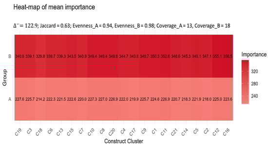 - (Mean Across Clusters): Let denote the mean importance of cluster in group . The overall between-group salience difference isThis provides a single magnitude of group difference corresponding to the heat-map.