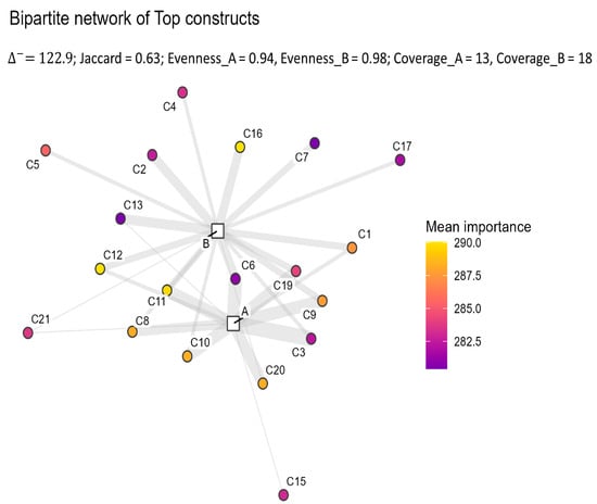 - Bipartite Graphs: Designed to enhance visualization, two-mode clustering projected the matrix into weighted adjacency networks for community detection, creating bipartite and one-mode graphs to depict element–construct clusters and reduce clutter via thresholding (Borgatti & Everett, 1997; Csardi et al., 2025). Convergent validity was examined by triangulating PCA groupings, hierarchical cluster memberships, and bipartite graphs with teacher interviews.