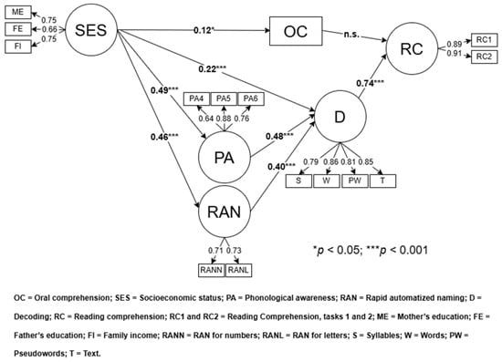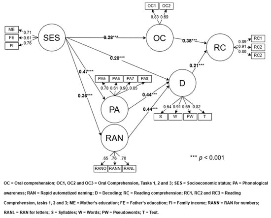 The effect of SES on reading precursors remained strong throughout elementary school, as shown in Figure 1, Figure 2 and Figure 3. However, when examining the total contribution of SES to reading comprehension, this contribution decreased across clusters: β = 0.48 (p < 0.001) in 2nd–3rd, β = 0.30 (p < 0.001) in 4th–5th, and β = 0.21 (p < 0.001) in 6th–7th grade.