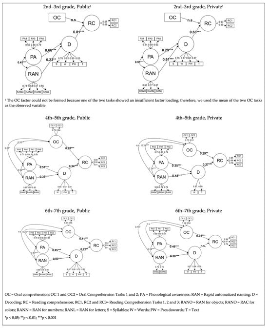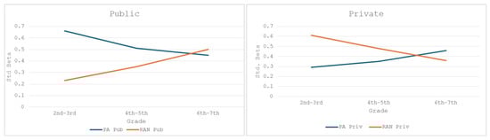 Similarly, regarding the behavior of the precursors PA and RAN, Figure 6 shows that in public education the expected theoretical pattern is maintained, with decreasing weight of PA and increasing weight of RAN, although the relationship between PA and decoding persists until 6th–7th grade (β = 0.46, p < 0.001). However, in private education the opposite pattern appears: the weight of PA increases throughout elementary school, while that of RAN decreases continuously. In both systems, the contributions of both precursors tend to converge in the final stage of elementary education.