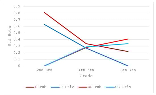Evolution of the explanatory power of D and OC for reading comprehension throughout elementary school, by grade and education system. D Pub = Decoding in public schools; D Priv = Decoding in private schools; OC Pub = Oral comprehension in public schools; OC Priv = Oral comprehension in private schools.