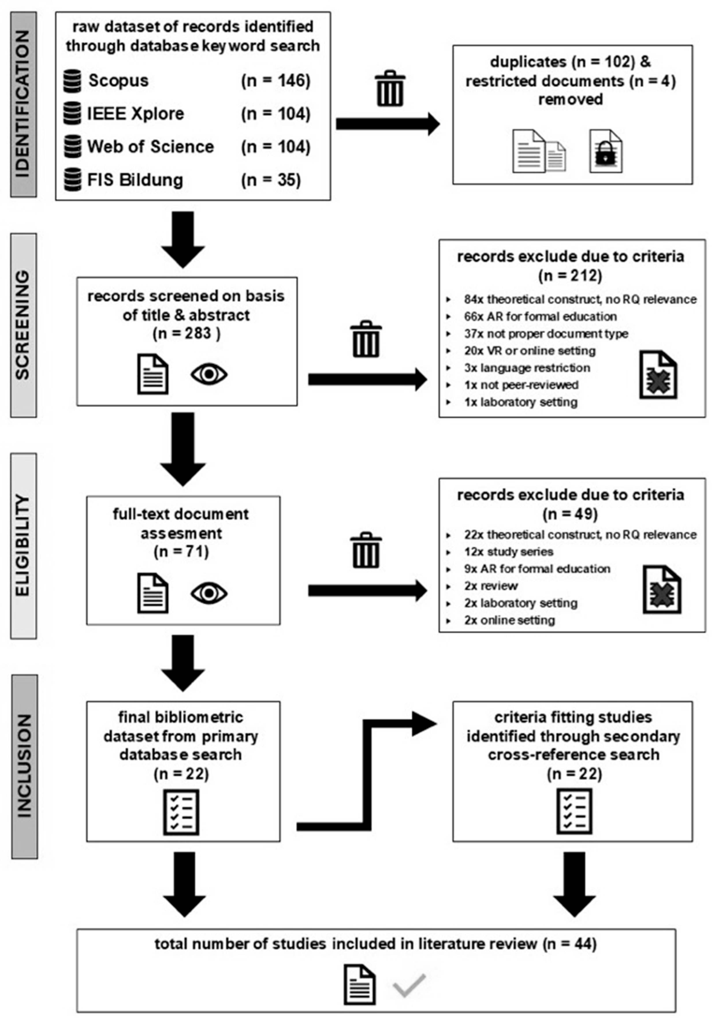| Relation to Review Topic | ✓ AR implementation in IILP ✓ examination of AR use on informal learning outcomes | X VR or other multimedia without AR X only online or simulated IILP setting, or no mention of a specific location X AR in formal education X AR evaluation from the technology implementation or user need perspective |