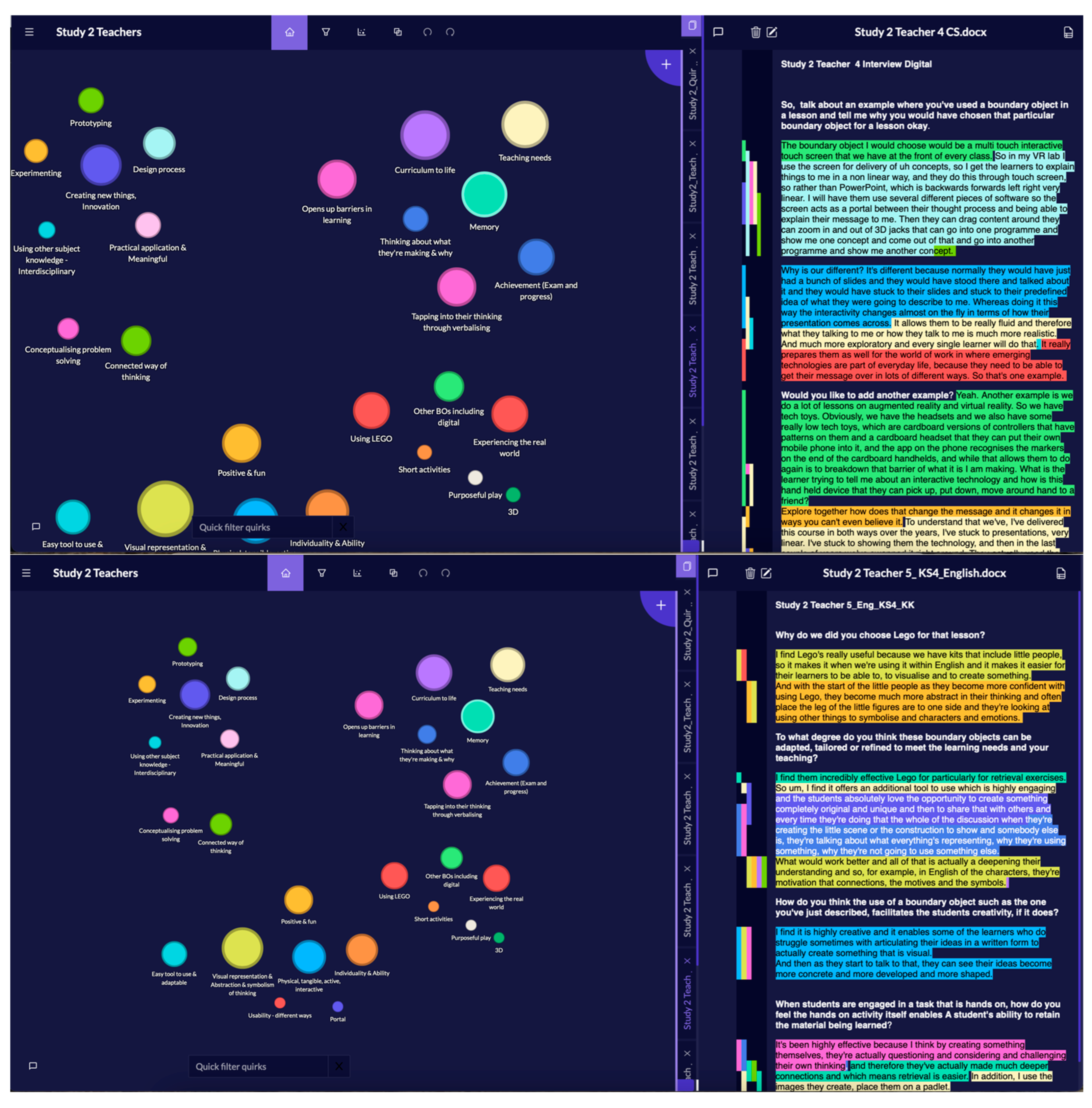 Quote 18, Figure 2b “Using 6 bricks, we did nature, nature. So, the way nature and nurture connects to each other. So … the environment works your biology and vice versa. Using this object is useful as you’re highlighting … you get to associate colours with certain things that you’re learning … Like … nature and you’ve got blue green … So, it’s helping you with association in the brain … but the fact that you thought that Oh pink maybe childhood and like red trauma for example, those colours …”.(Biology, Year 13)