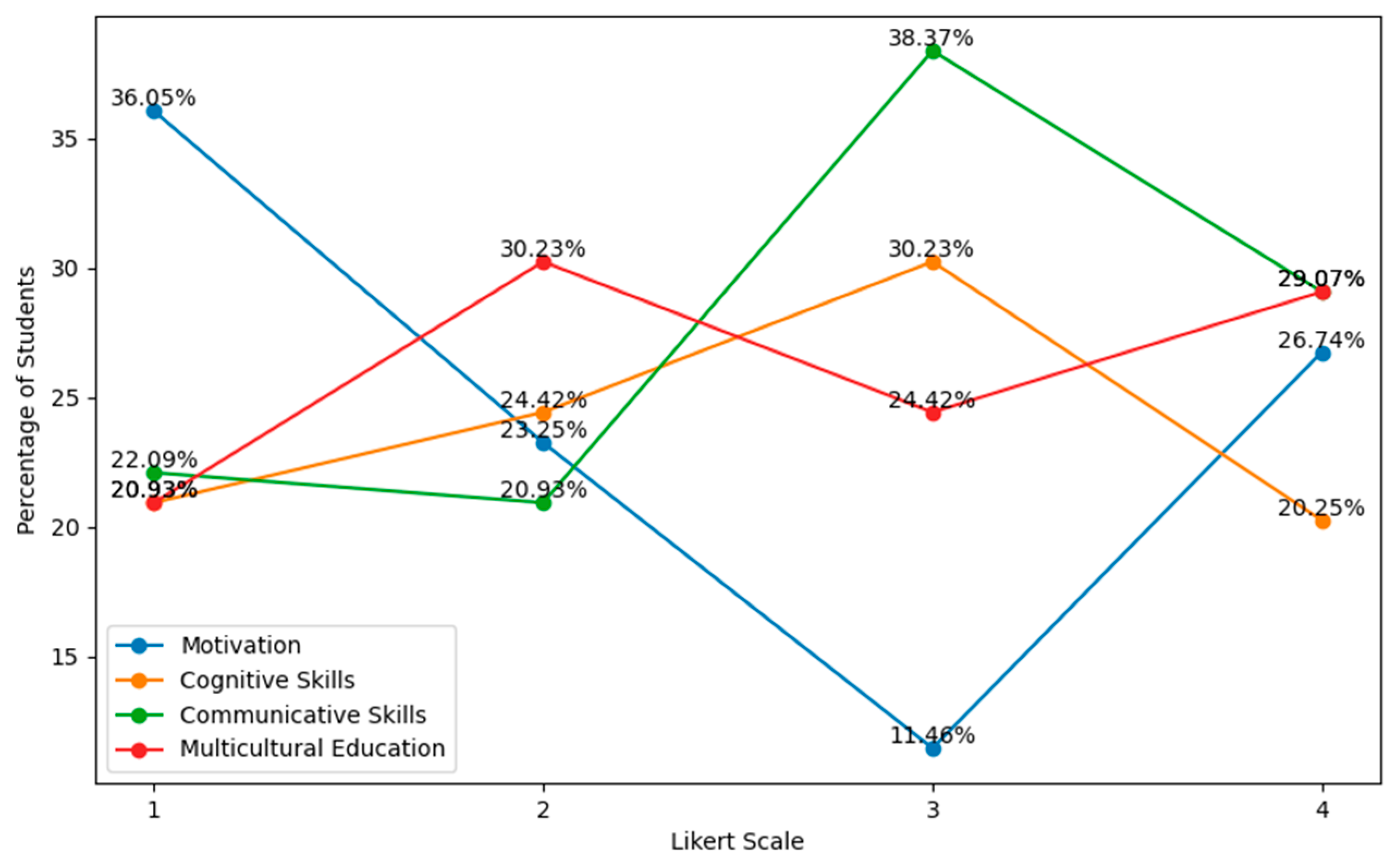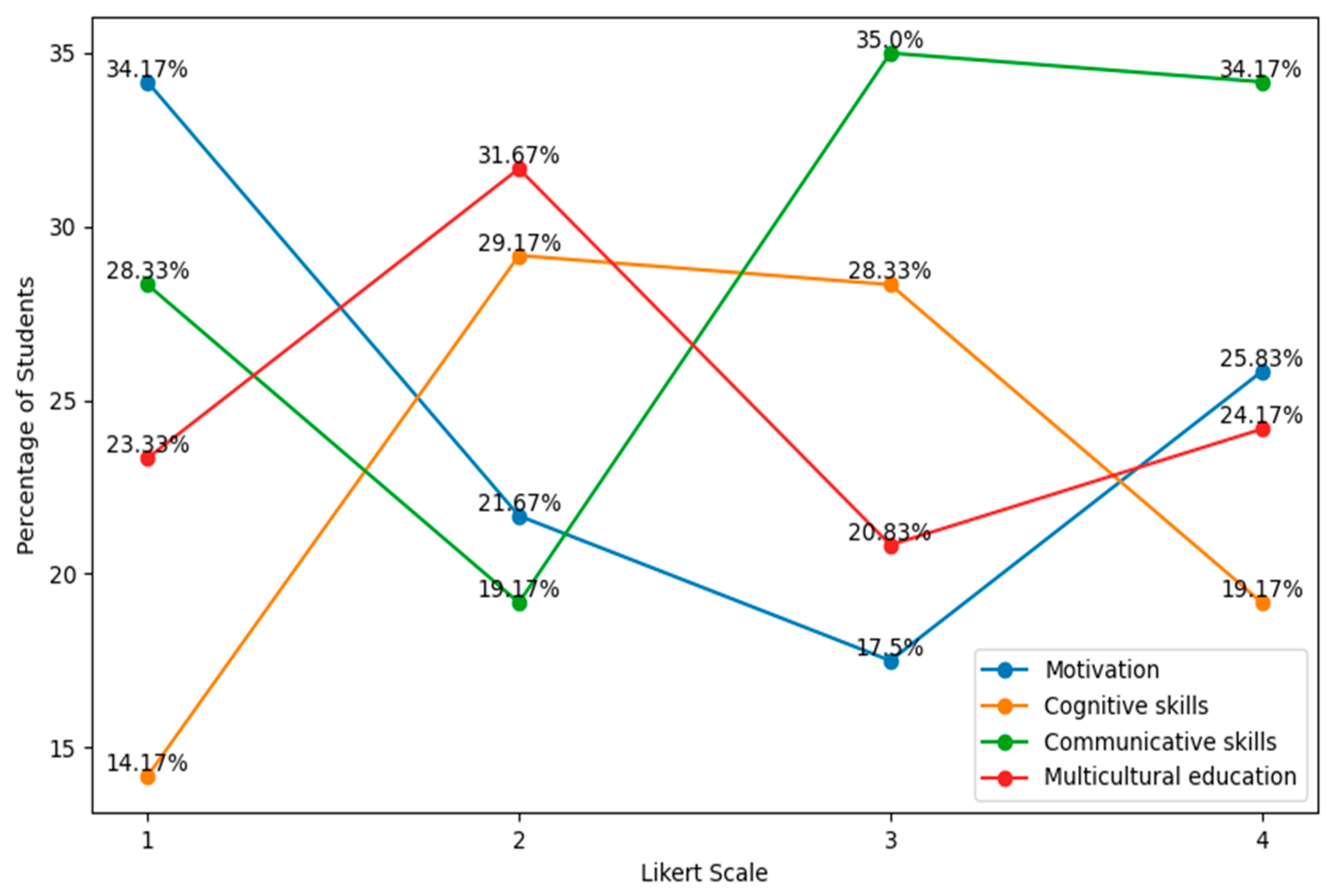 Figure 4 present the distribution of responses of pre-primary and primary STs by Likert scale option (1 to 4), including the relative percentages associated with each response category: