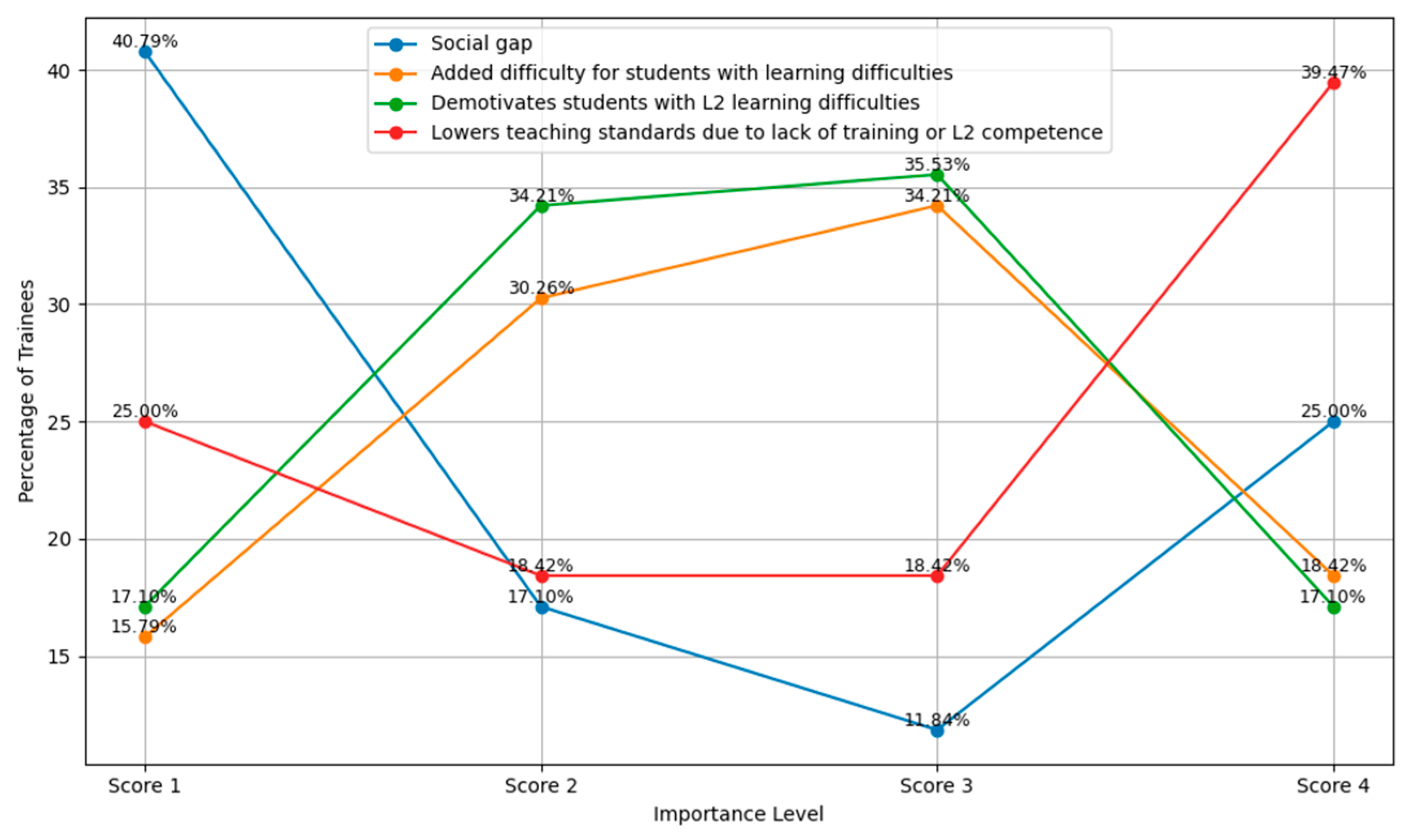 Figure 2 present the distribution of responses of pre-primary and primary STs by Likert scale option (1 to 4). Each curve represents a factor, highlighted in a different colour, and the percentages indicate how many trainees rated that factor at each importance level: