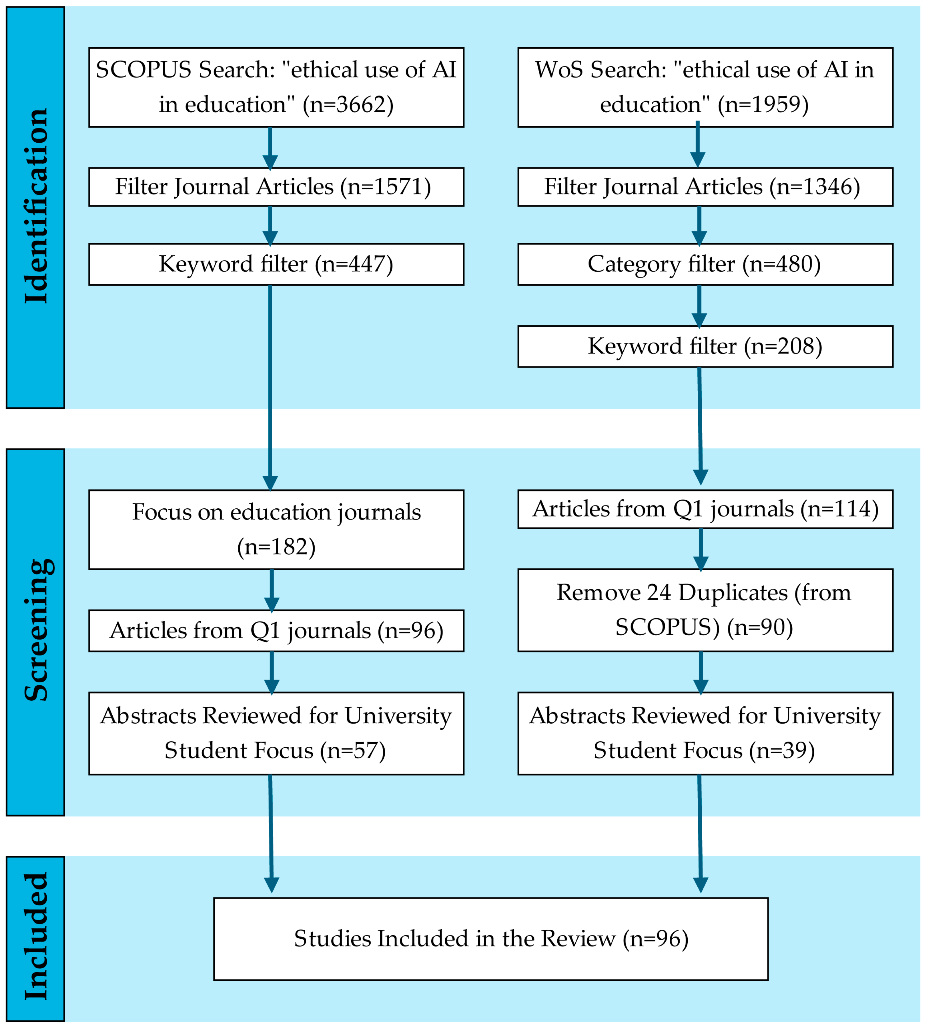 The search term “ethical use of AI in education” was initially applied in SCOPUS, yielding 3662 results. From this, only journal articles were retained (1571), which were further refined using keywords such as “education,” “higher education,” “university,” and “university students” (447 results). Articles were then filtered to include only those published in journals focused on education, learning, and teaching (182), and further narrowed to Q1-ranked journals (96). Following this, abstracts were carefully reviewed to ensure the studies specifically addressed university students, resulting in a final shortlist of 57 articles suitable for data synthesis.
