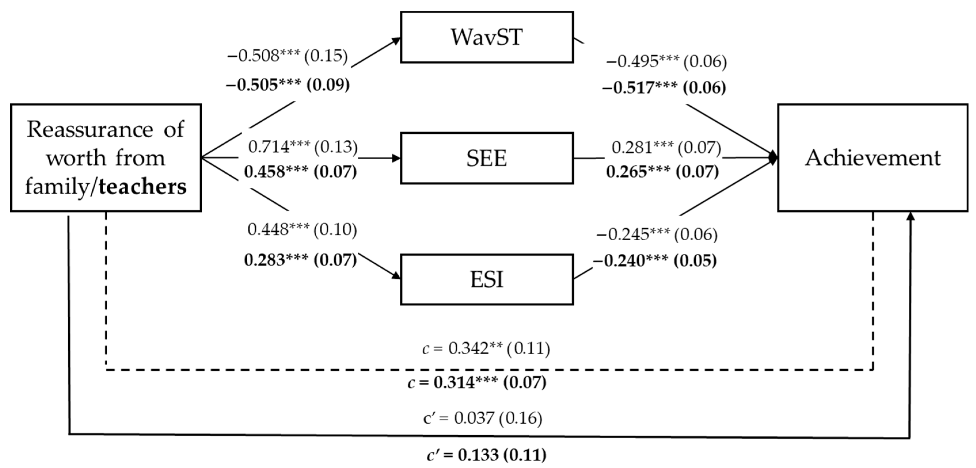 3.2.3. MRSs as Associative Mediators in the Relationship Between Reassurance of Worth from Family and Teachers and Achievement