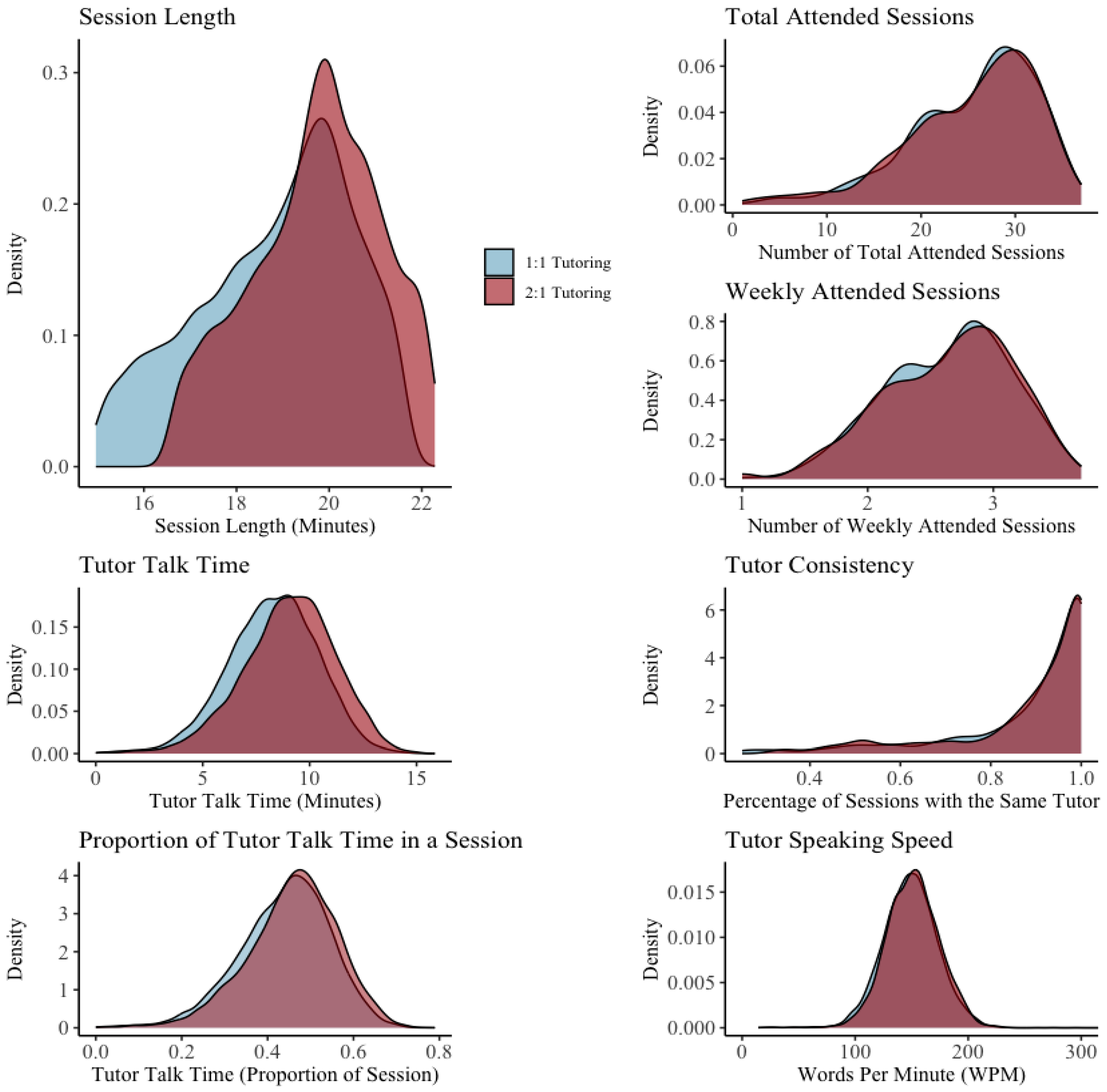 Nickow et al., 2024). The differential effectiveness between one-on-one and two-on-one tutoring motivates our analysis of the differences between one-on-one and two-on-one tutoring sessions.