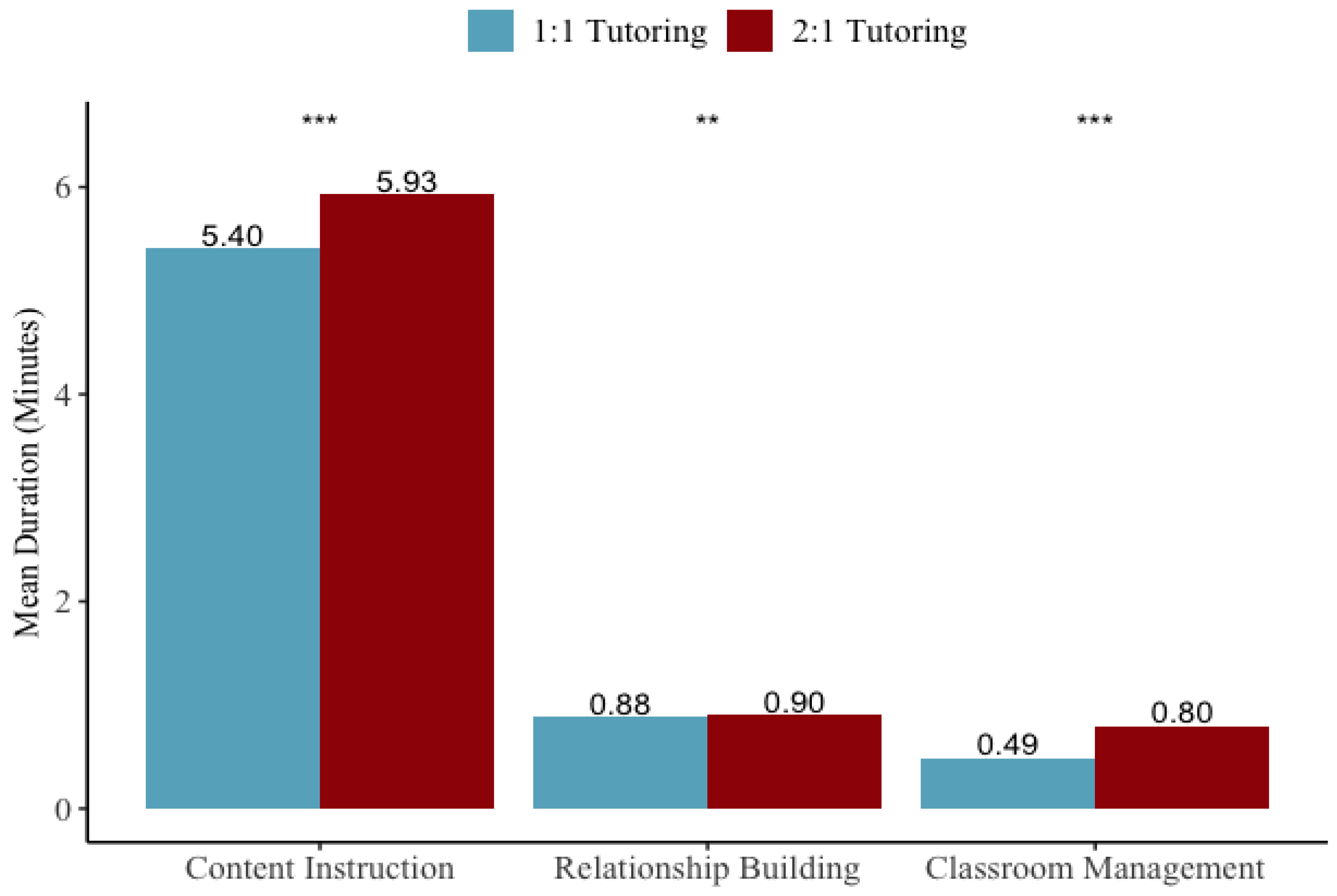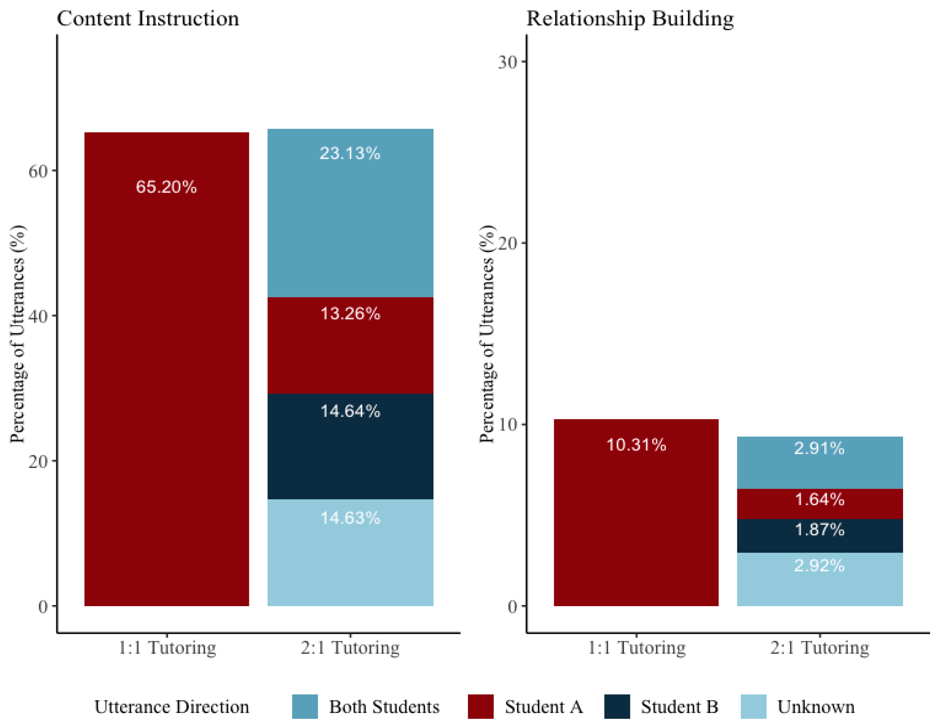 RQ2: How does time allocation vary between one-on-one and two-on-one tutoring? In particular, how much talk time do tutors spend on instruction, relationship building, and classroom-management, and how do tutors in two-on-one sessions allocate their attention between their students for these topics?