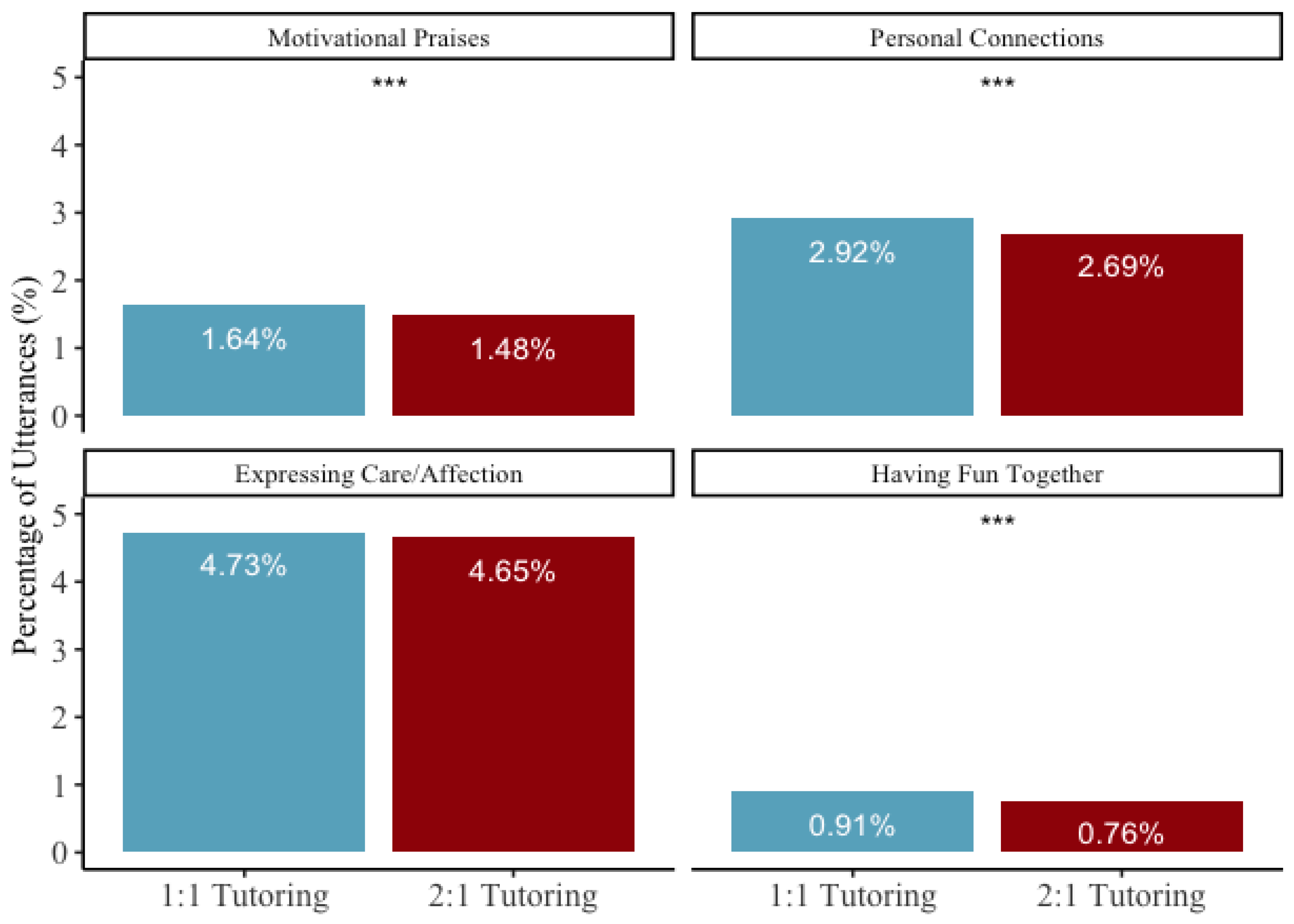 To date, no research has systematically analyzed tutor utterances at a large scale to understand the quantity and quality of tutoring provided. Instead, researchers have administered surveys or collected anecdotes from school administrators and practitioners to explore how relationship-building contributes to student engagement or how educators may deploy different pedagogical approaches (e.g.,
