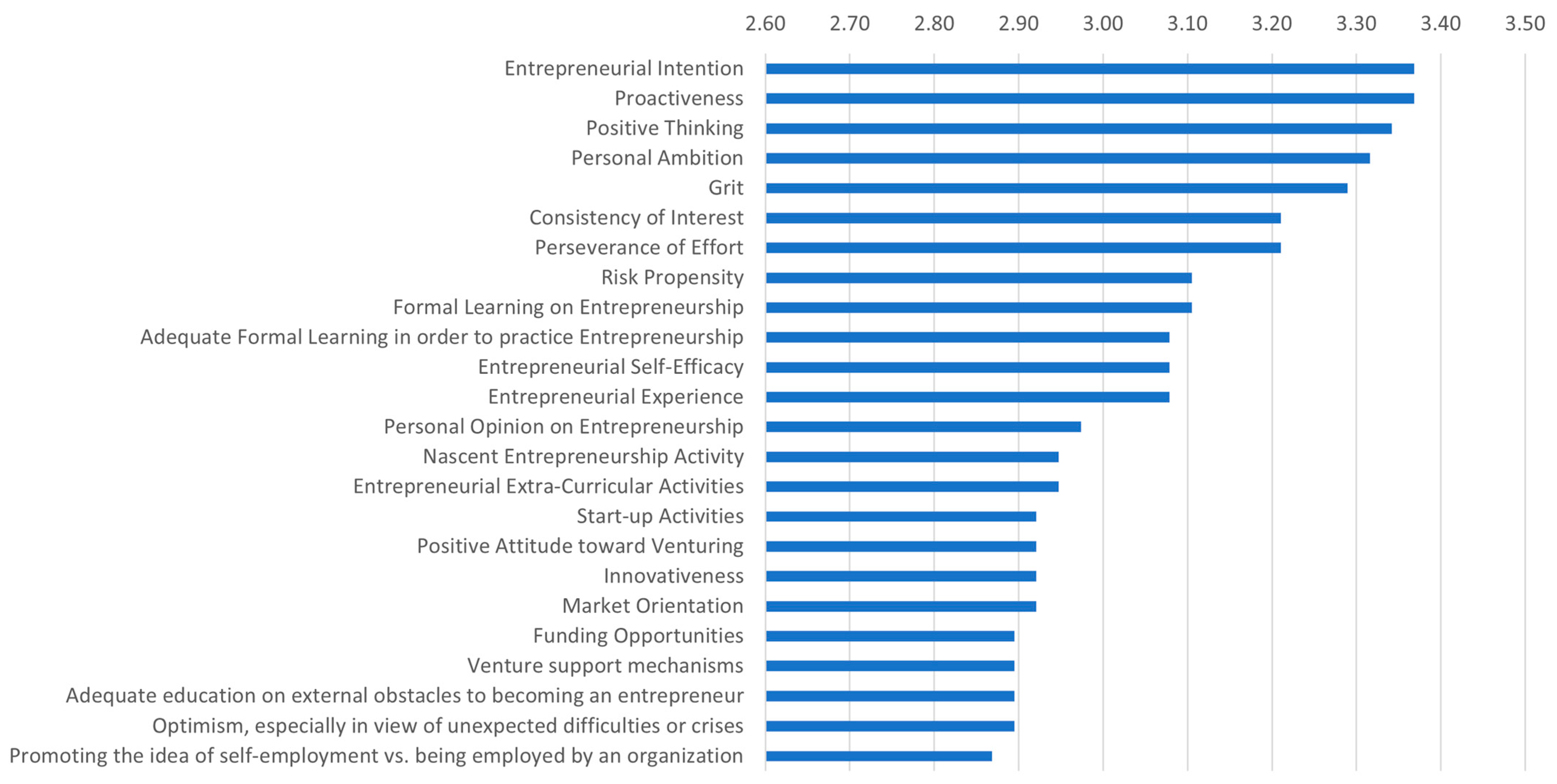 | 22 | Adequate education on external obstacles to becoming an entrepreneur | 2.80 | 1.03 | 3.11 | 0.93 | 3.10 | 0.74 | 2.89 | 0.78 | 2.89 | 0.98 |
