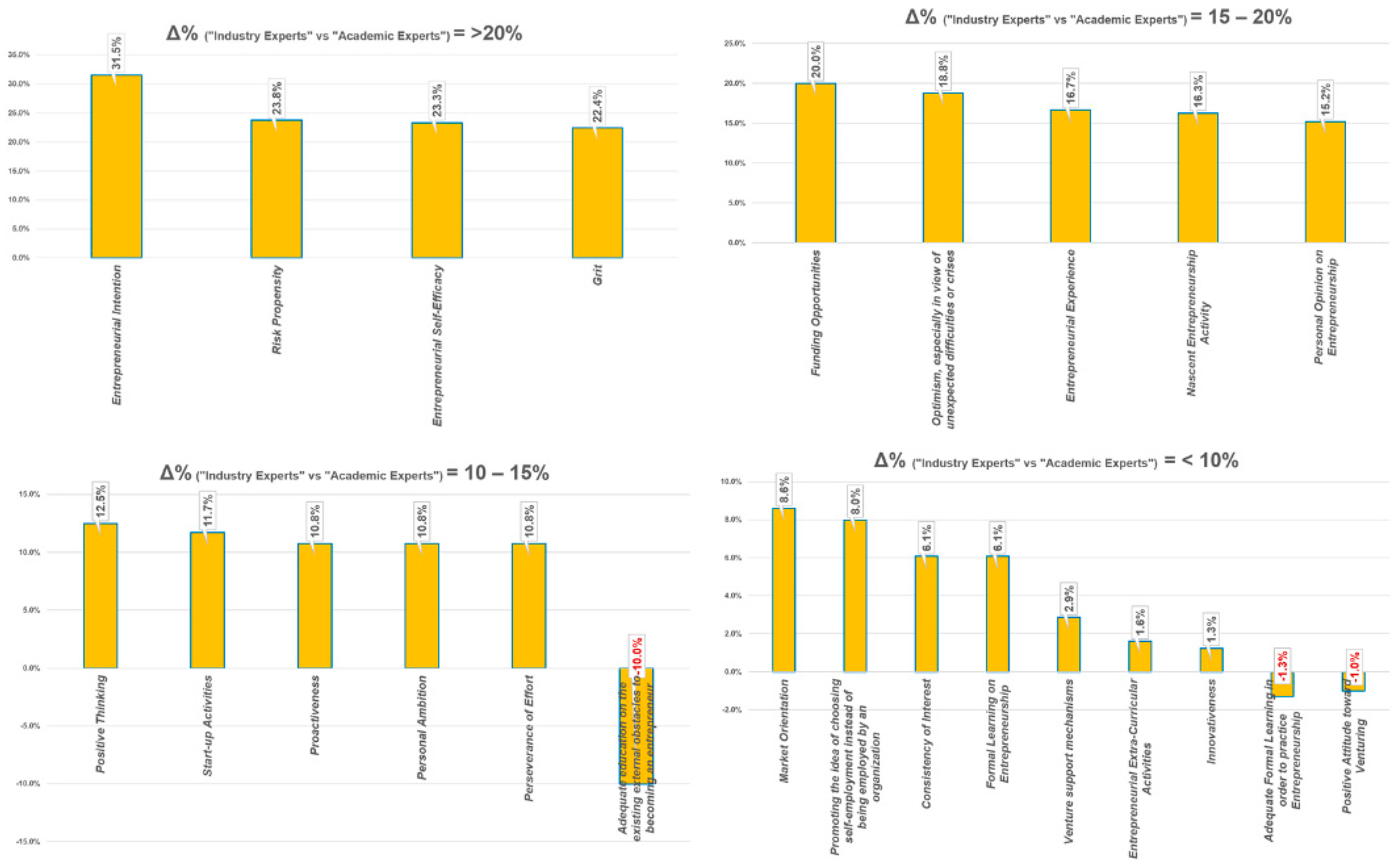 - Venture Support Mechanisms: Industry experts saw these as less critical than personal traits like risk-taking and resilience, suggesting that while support is valuable, success depends more on individual characteristics.
