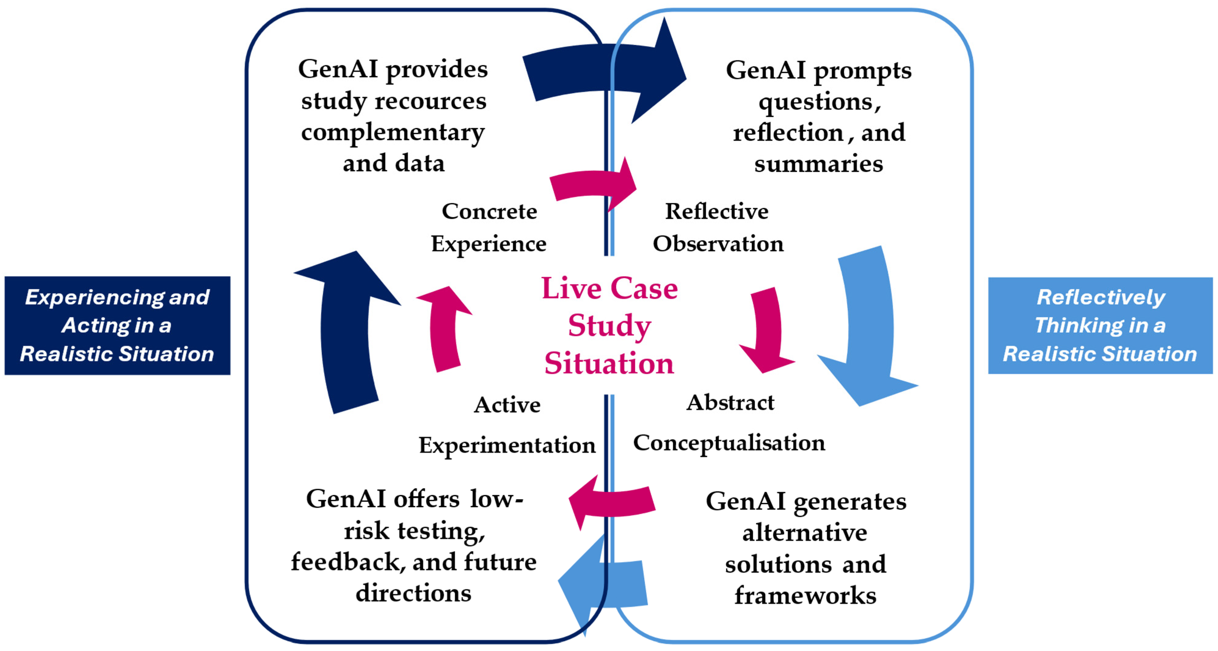 - Design structured prompts: Scaffold iterative use of GenAI across Kolb’s stages (CE, RO, AC, and AE).