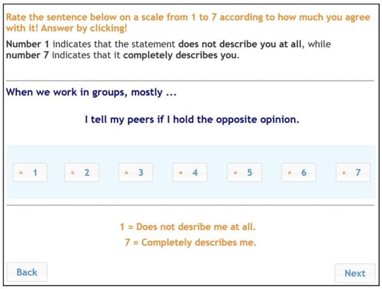 In the initial version of the scale, students were asked to evaluate the statements on a five-point Likert-type scale indicating the extent to which each statement described them. The majority of respondents rated their collaborative skills as relatively highly developed, resulting in a right-skewed response distribution. In addition, the variance of the composite scores was low relative to their mean. To address these issues, we replaced the five-point scale with a seven-point scale (1—Does not describe me at all, to 7—Completely describes me), with the expectation that this would enable respondents to provide more differentiated self-assessments and thereby improve the reliability of the instrument.