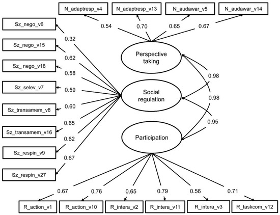 In summary, a total of 18 statements were removed, including all 15 reverse-scored items. The shortened 18-item scale includes six items in the Participation subscale, four items in the Perspective taking subscale, and eight items in the Social regulation subscale (Table 4). At least one of the 18 statements is linked to each of the nine subskills. The Negotiation subskill is assessed by three items, while seven other subskills are assessed by two items each. Self-evaluation is the only subskill tied to which only one item remained in the shortened scale. The reliability of the 18-item scale is high (Cronbach’s α = 0.90, McDonald’s ω = 0.90), and the reliability for the three subscales is also satisfactory, considering the number of items (both Cronbach’s α and McDonald’s ω ≥ 0.70) (Table 5).