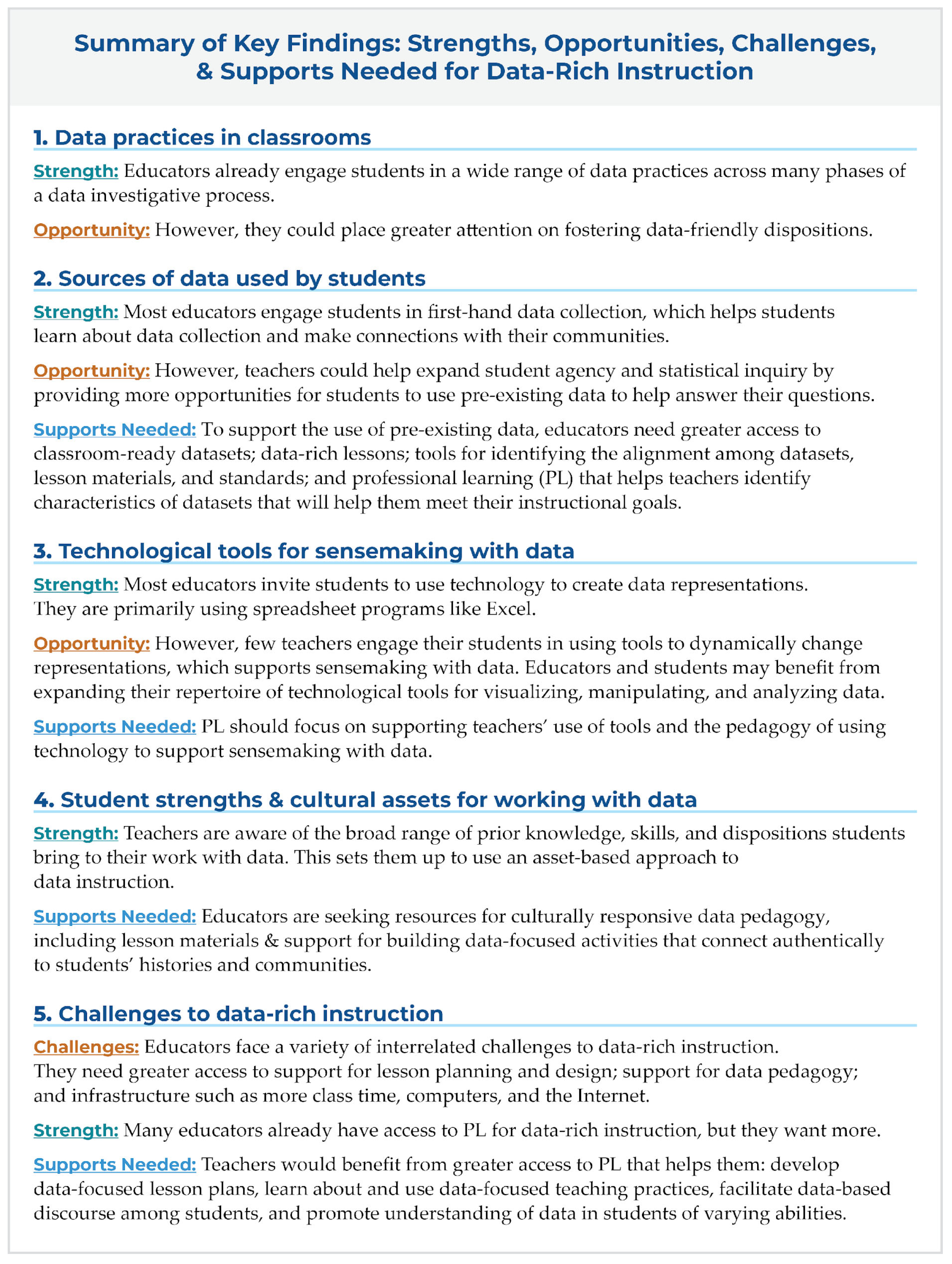 Figure 1. Summary of five key findings highlighting the strengths, opportunities, and supports educators need to implement data-rich instruction effectively.