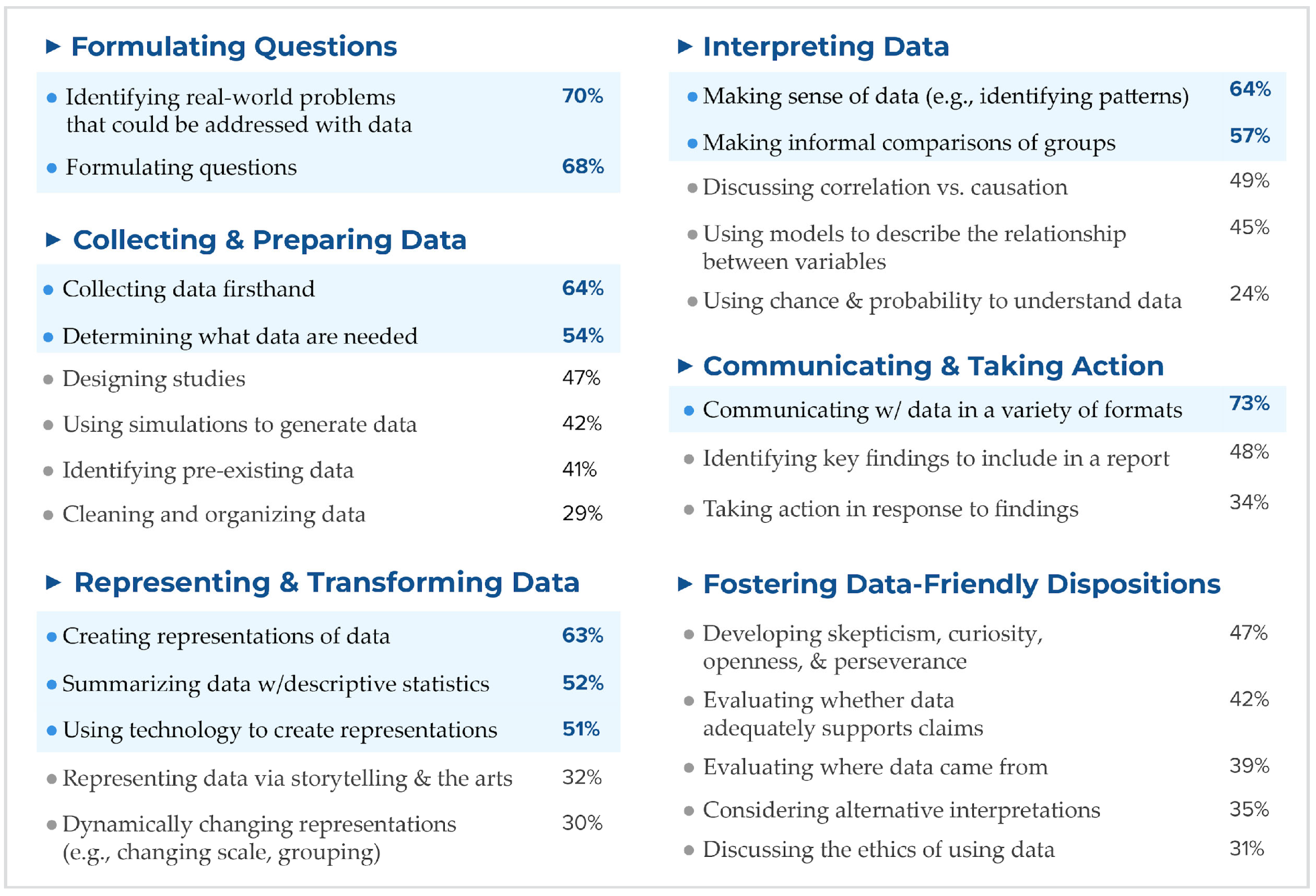 Beyond procedural and contextual knowledge, Wild and Pfannkuch (1999) identified key dispositions, including curiosity and awareness, engagement, imagination, skepticism, being logical, propensity to seek deeper meaning, openness, and perseverance, through interviews with statisticians and observations of students engaged in statistical problem solving. In his framework, Gal (2002) includes a critical stance toward data as one key component of the disposition needed for statistical literacy. “A first expectation is that adults hold a propensity to adopt, without external cues, a questioning attitude towards quantitative messages that may be misleading, one-sided, biased, or incomplete in some way” (p. 18). Similarly, H. S. Lee and Tran (2015) outline a set of “habits of mind” for approaching statistical investigations, which include considering the context of the data, embracing uncertainty, and being skeptical. These dispositions and habits of mind are important for data-rich instruction because they help users become informed creators and consumers of data, engage in creative problem-solving with data, and persevere through the numerous challenges of working with data. Fostering data-friendly dispositions presents a valuable learning opportunity for educators and their students, as these dispositions are central to data inquiry.