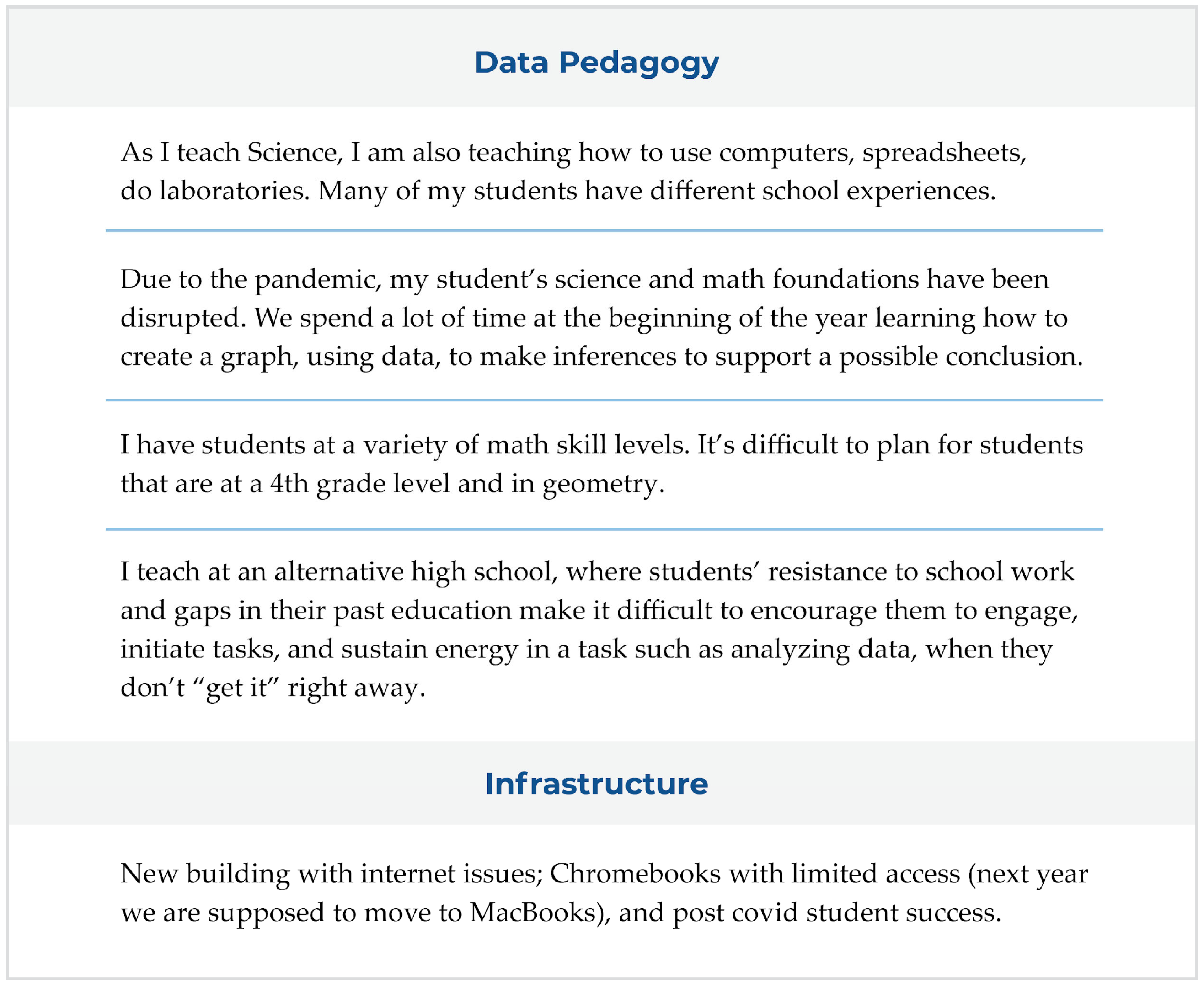 For each quantitative finding presented, we systematically reviewed all tagged excerpts relevant to the finding and selected 1–3 quotes that best served our analytical purposes. Priority was given to quotes that either (a) explained mechanisms underlying quantitative patterns, (b) illustrated promising practices to address identified challenges, (c) provided concrete examples of abstract (or poorly defined) ideas from the survey, or (d) offered insights that could inform professional learning design.
