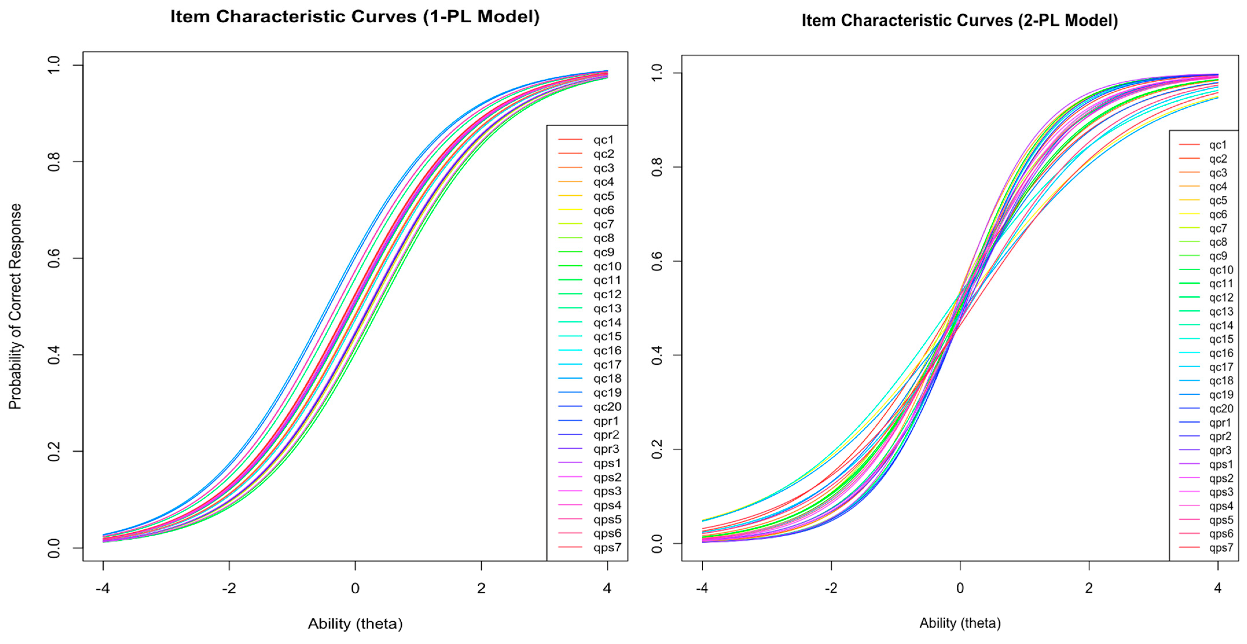 - Chalmers, R. P. (2012). mirt: A multidimensional item response theory package for the R environment. Journal of Statistical Software, 48(6), 1–29. [Google Scholar] [CrossRef]
