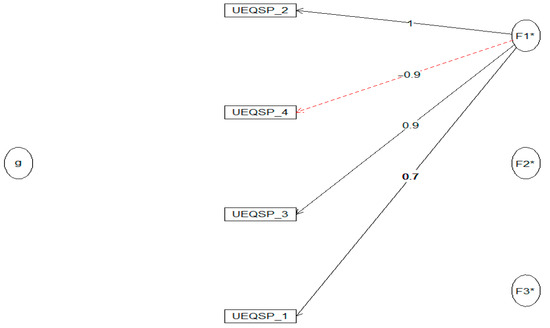 A McDonald’s Omega was conducted to assess the internal consistency of the UEQ-S pragmatic scale. The Omega hierarchical (ωh = 0.73) indicated that 73% of the variance in the UEQS pragmatic section of the UEQ-S questionnaire was due to a general factor. The Omega Total (ωt = 0.76) highlighted that the scale has an acceptable internal consistency. All items were retained. Factor loadings shown in Figure 7.