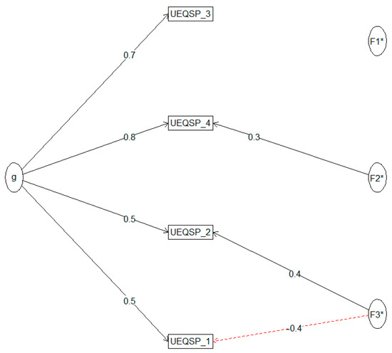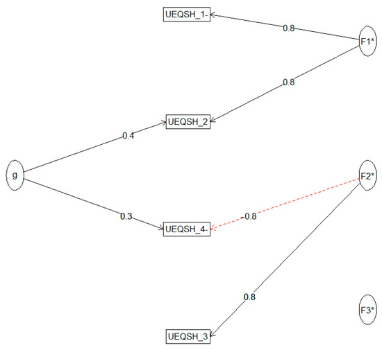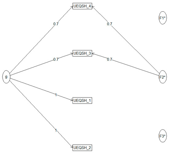 A McDonald’s Omega was conducted to assess the internal consistency of the questionnaire. An Omega hierarchical (ωh = 0.83) indicated that 83% of the variance in the hedonic section of the UEQ-S questionnaire was due to a general factor. The Omega Total (ωt = 0.98) highlighted that the scale has excellent internal consistency. All items were retained, with factor loadings presented in Figure 8.