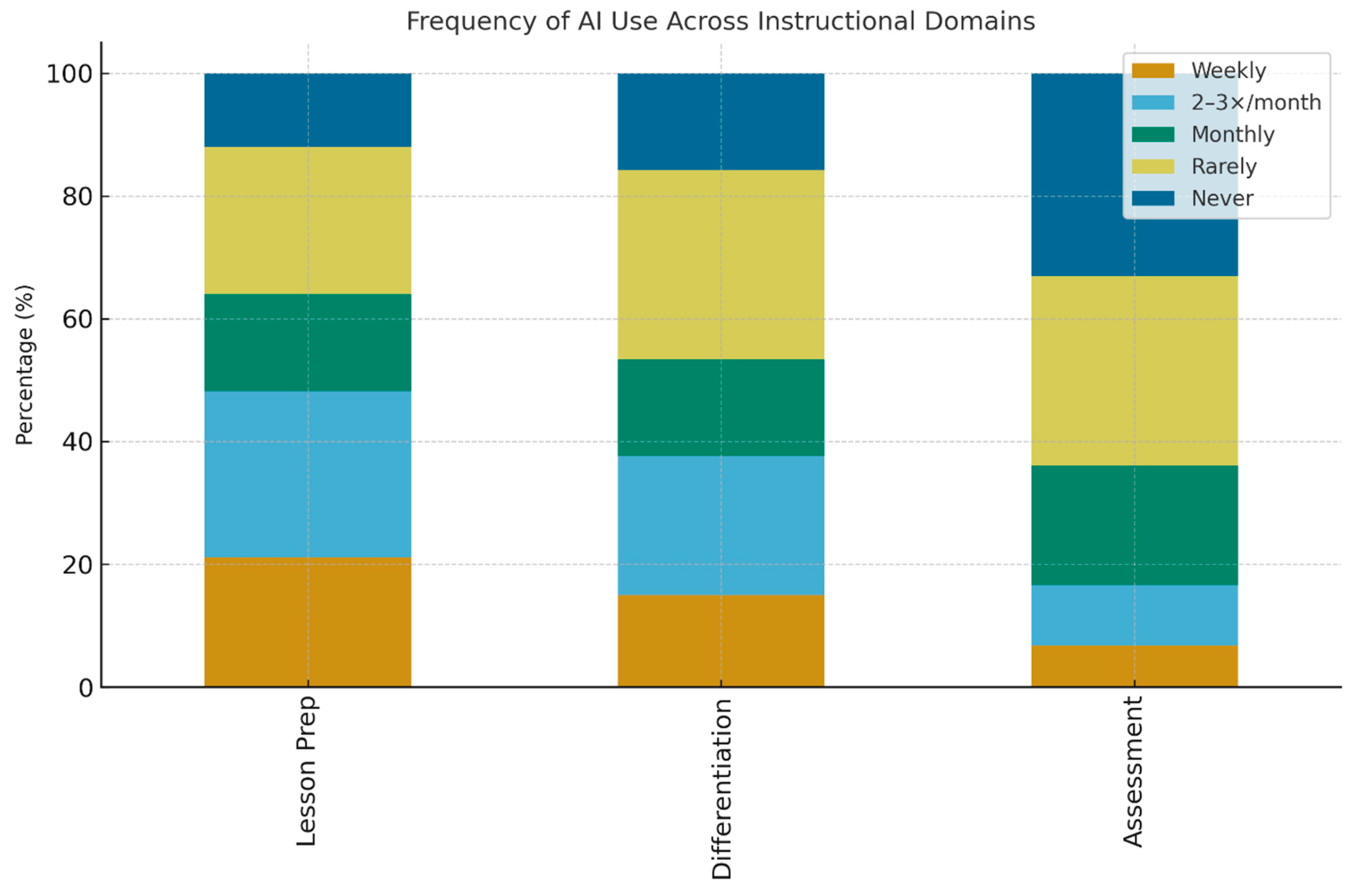 The task-level distribution observed here, strongest traction in lesson preparation and differentiation, with more hesitant use for assessment, can be interpreted through established technology adoption frameworks. From the perspective of Ertmer’s first- and second-order barriers, low-barrier, high-utility tasks such as lesson planning and resource adaptation are more readily adopted because they require limited institutional change and align closely with instructors’ existing pedagogical practices. This pattern is consistent with prior analyses of early-stage AI and LLM adoption, which show that low-risk, efficiency-oriented workflows tend to dominate initial use (
