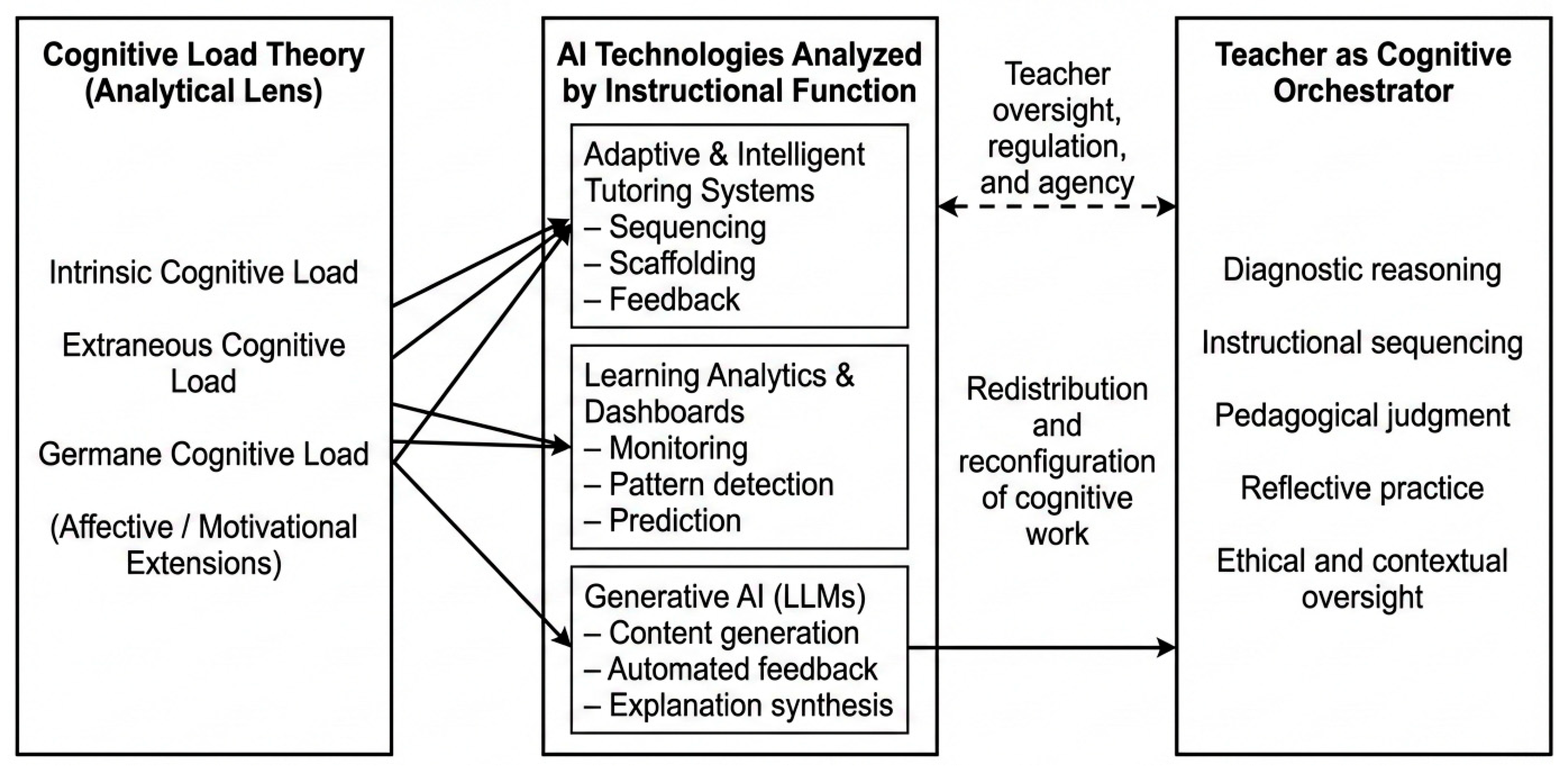 This paper is positioned as a conceptual synthesis that bridges three bodies of literature that are rarely integrated in a systematic manner: (1) CLT, (2) research on AI-enabled instructional systems, and (3) scholarship on teacher expertise and professional judgment. Rather than reviewing AI applications descriptively or evaluating their effectiveness empirically, the paper develops a theoretically grounded framework for analyzing how AI alters the distribution of intrinsic, extraneous, and germane cognitive loads across human and algorithmic actors. In this sense, CLT is used not only as an explanatory framework for learning but as an analytical lens for understanding professional cognition.