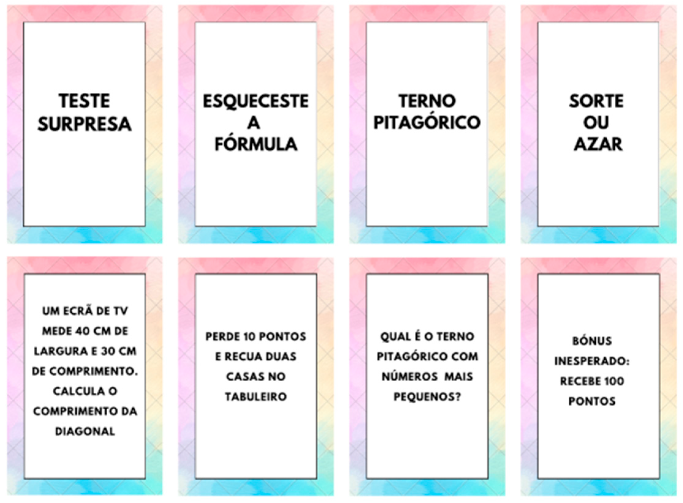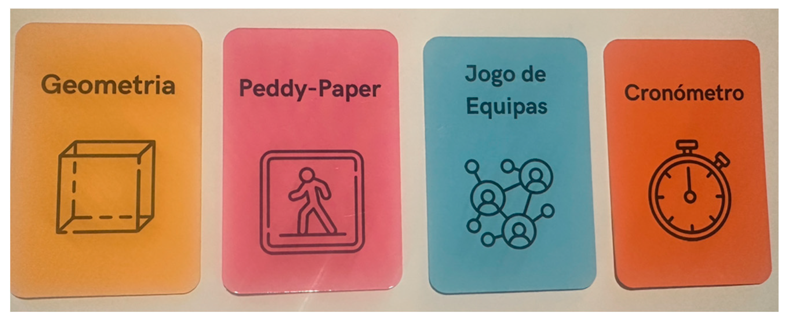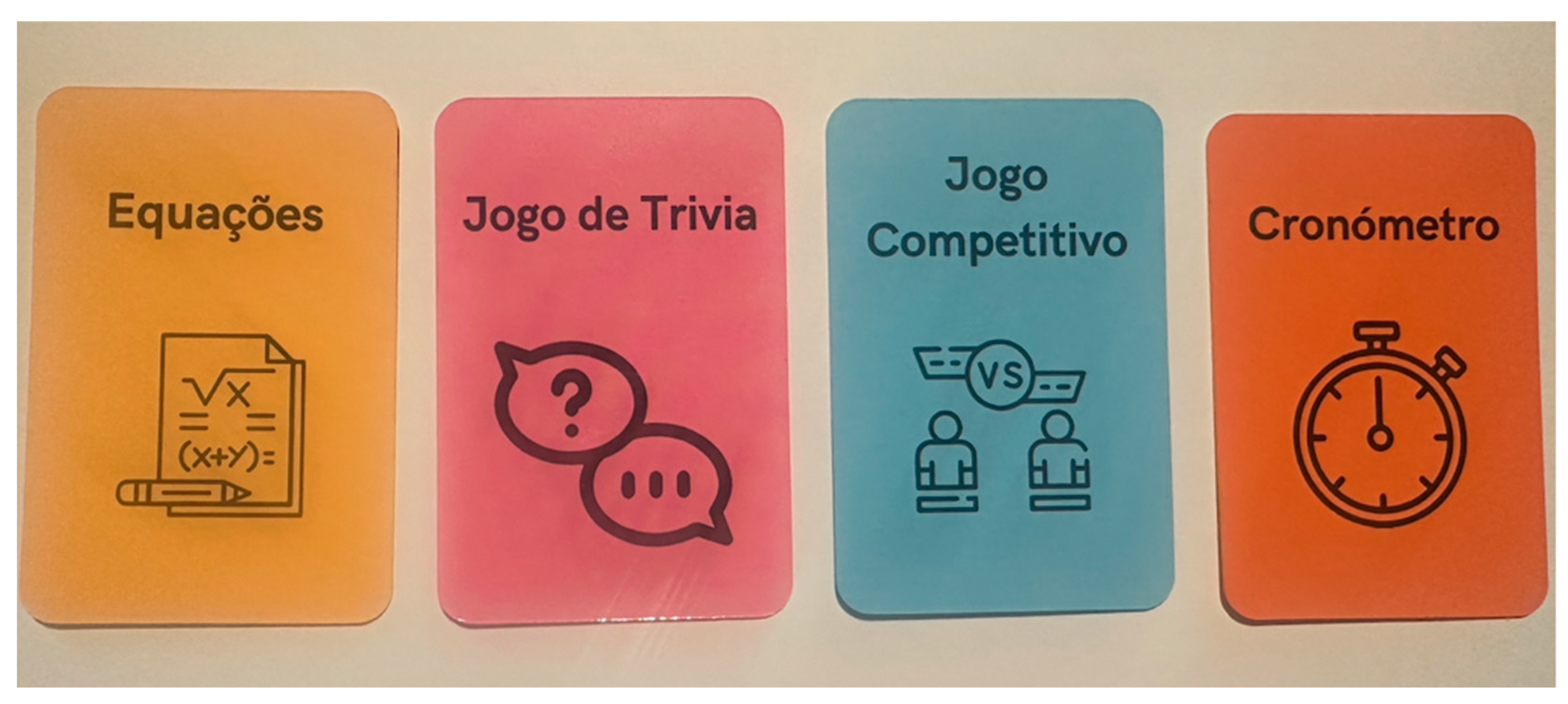 In total, 17 games were developed across the four participating classes, covering a wide range of formats such as card games, board games, trivia, treasure hunts, dice games, and team-based games. Overall, the games designed by the students revealed a wide diversity of formats, themes, and mechanics. The mathematical topics explored were equally diverse, including equations, algebra, geometry, probability, the Pythagorean theorem, and functions. In most cases, the games were designed with an explicit instructional intention, although some presented lower levels of detail or occasional formulation inaccuracies.