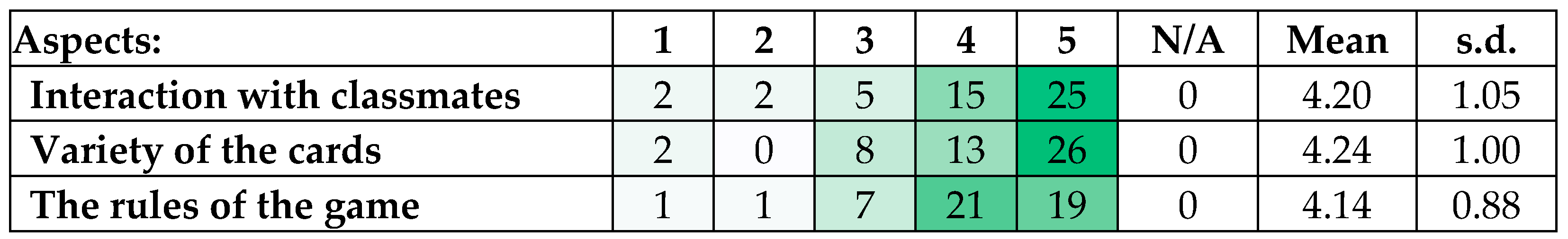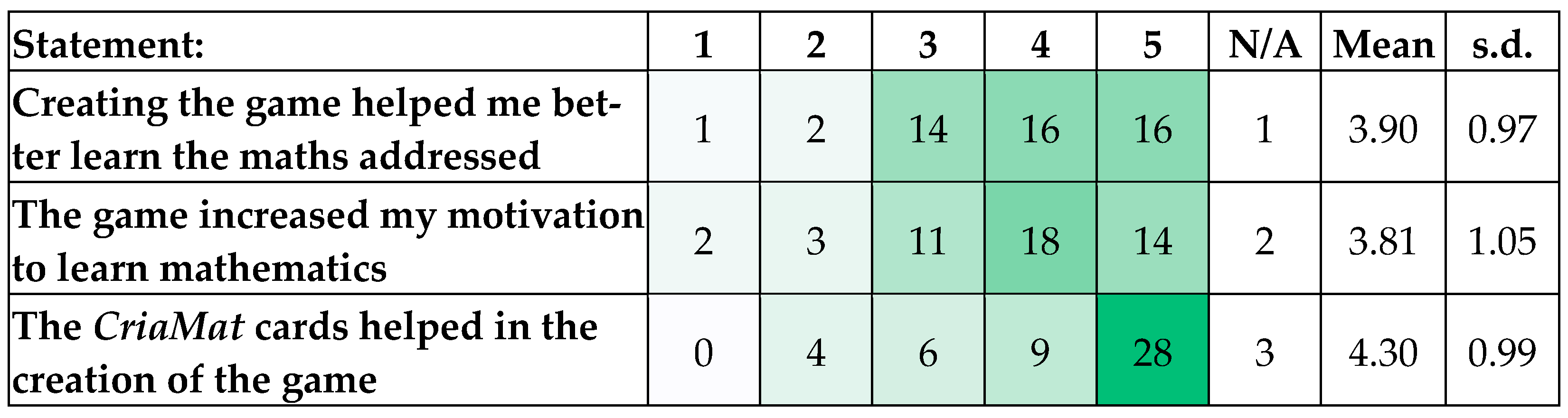 Students were also asked to indicate their level of agreement with three statements related to the game-creation experience, using a 5-point Likert scale (1 = strongly disagree; 5 = strongly agree). The heatmap in