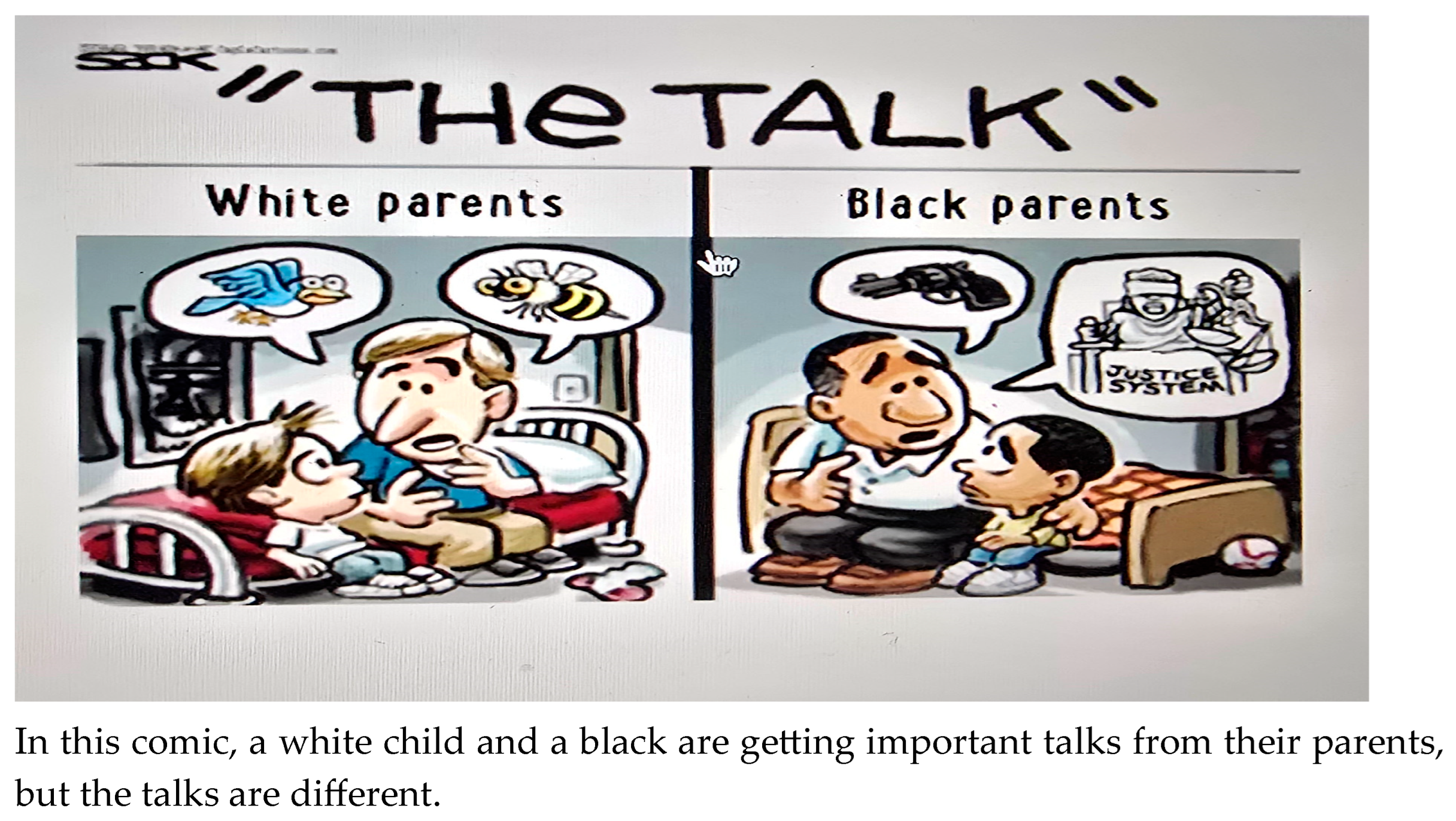 This artifact ties into a vital lesson we discussed during the previous week in class, ‘The talk’ is a tough topic that people of color [POC] have to discuss with their children to keep them safe. I feel that this cartoon effectively represents the differences between the conversations of white families and black families. Most white children will never have the same talk as black children due to the “power of the benefit of the doubt,” mentioned in C. Collins’ (2018) article. People of color get the talk about racial profiling and stereotypes. The white child seems to have their innocence of the world still, while the other child has to learn how the world really works so early on in their lives. This is because society will treat them differently, as expressed in the speech bubbles. This is why most white children have no idea about these harsh topics, and that is a privilege, while black children must walk around with their invisible backpack of concerns and careful living.